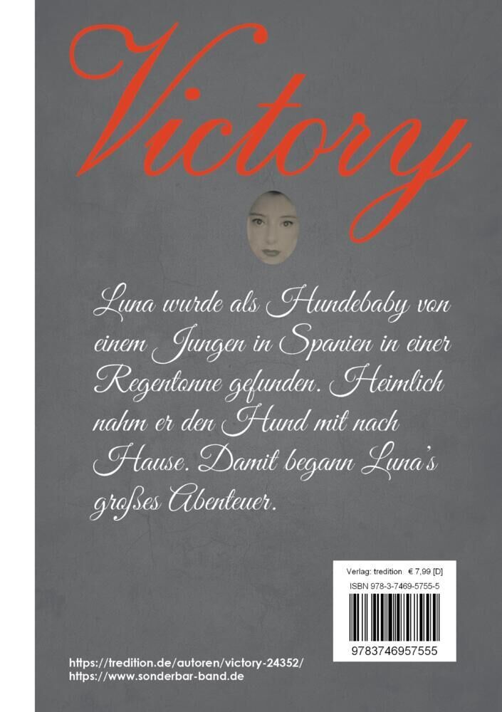 Luna wurde als Hundebaby von einem Jungen in Spanien in einer Regentonne gefunden. Heimlich nahm er den Hund mit nach Hause. Damit begann Luna`s großes Abenteuer. Autorentext Victory begann schon als Kind, die ersten Romane zu schreiben. Ihr Hobby wurde für si...