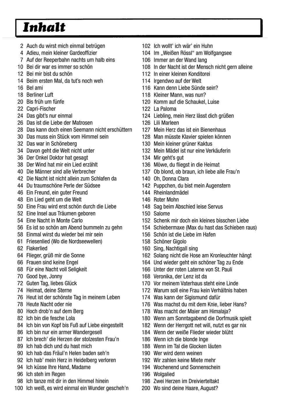 Diese Sammlung vereint 100 der legendären deutschen Schlager der 20er bis 40er Jahre in einem Buch, unter anderem die Hits Auf der Reeperbahn nachts um halb eins", Zwei Herzen im Dreivierteltakt", Berliner Luft", Capri-Fischer und Ein Freund, ein guter Freund"...