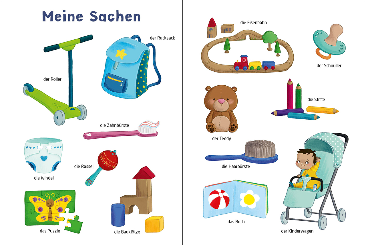 Das weiß ich schon! In diesem großen Bildwörterbuch finden Kinder die 100 wichtigsten Begriffe aus ihrer Alltagswelt. Ob Hund, Auto, Schnuller oder Blume - hier können schon die Kleinsten Gegenstände wiedererkennen und benennen. So wird spielerisch der Sprache...