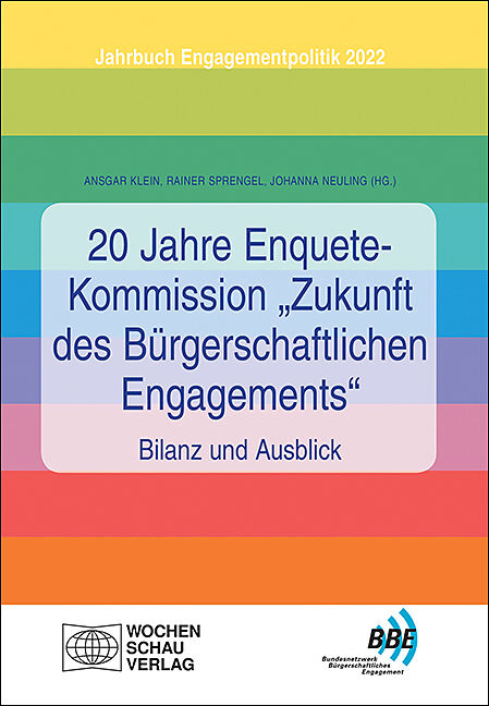 Das Schwerpunktthema des Jahrbuchs Engagementpolitik 2022 bilanziert die bis heute feststellbaren Auswirkungen nach 20 Jahren Enquete-Kommission Zukunft des Bürgerschaftlichen Engagements und wagt einen Blick in die Zukunft. Der Blick zurück führt zu den Handl...Das Schwerpunktthema des Jahrbuchs Engagementpolitik 2022 bilanziert die bis heute feststellbaren Auswirkungen nach 20 Jahren Enquete-Kommission Zukunft des Bürgerschaftlichen Engagements und wagt einen Blick in die Zukunft. Der Blick zurück führt zu den Handlungsempfehlungen der Enquete-Kommission und ihrer Arbeit. Der Abschlussbericht der Enquete-Kommission kann heute als Geburtsstunde einer modernen, im engen Zusammenhang zu entwickelnden Engagement- und Demokratiepolitik angesehen werden. Mehrere ehemalige Mitglieder der Kommission reflektieren nicht nur Erreichtes bzw. Liegengebliebenes, sondern auch das Aufkommen neuer Herausforderungen. Nicht zuletzt bietet das Jahrbuch auch einen umfassenden Überblick über die Arbeit des Bundesnetzwerks Bürgerschaftliches Engagement (BBE).