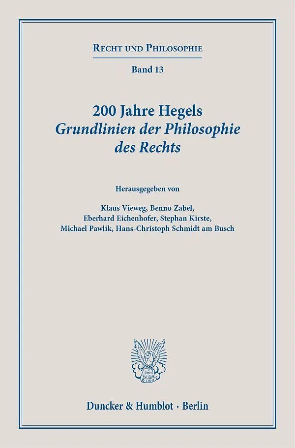 Klaus Vieweg und Benno Zabel: Hegels Rechtsphilosophie als praktische Philosophie der Freiheit 200 Jahre nach der Hauptschrift gegen die Restaurationsideologie Stephan Kirste: Die Positivität des Rechts bei Hegel. Hegels Philosophie der Positivität des Rechts und Hugos Philosophie des positiven Rechts Thomas Meyer: Zum Verhältnis von Recht und Rechten in Hegels »Grundlinien« Klaus Vieweg: In tyrannos Inversives Not- und Widerstandsrecht bei Hegel Folko Zander: Die Logik des Zwangs bei Kant und Hegel Stephan Stübinger: Der Vergeltungsgedanke bei Hegel und in der aktuellen Diskussion. Zur Differenz zwischen philosophischen und empirischen Strafbegründungen Giulia Battistoni: Karl Heinrich Gros' »Über die Idee der Alten vom Schicksal«: eine Quelle für Hegels Verständnis der Verwicklungen von Schicksal, Zurechnung und Strafe zwischen Alten und Modernen? Tereza Matjková: Über Hegels Heuchler: seichtes Denken und verborgenes Böses Christian Krijnen: Hegels Rechtsphilosophie und die Grundlegung des Begriffs der Organisation Pirmin Stekeler-Weithofer: Freiheit und Institutionen bei Hegel Eberhard Eichenhofer: Hegels Entdeckungen: soziale Frage und sozialer Staat Sebastian Ostritsch: Hegels Kritik des Kosmopolitismus Christopher Yeomans: Institutionelle Dimensionen der Geschichtlichkeit des Hegelschen Staates