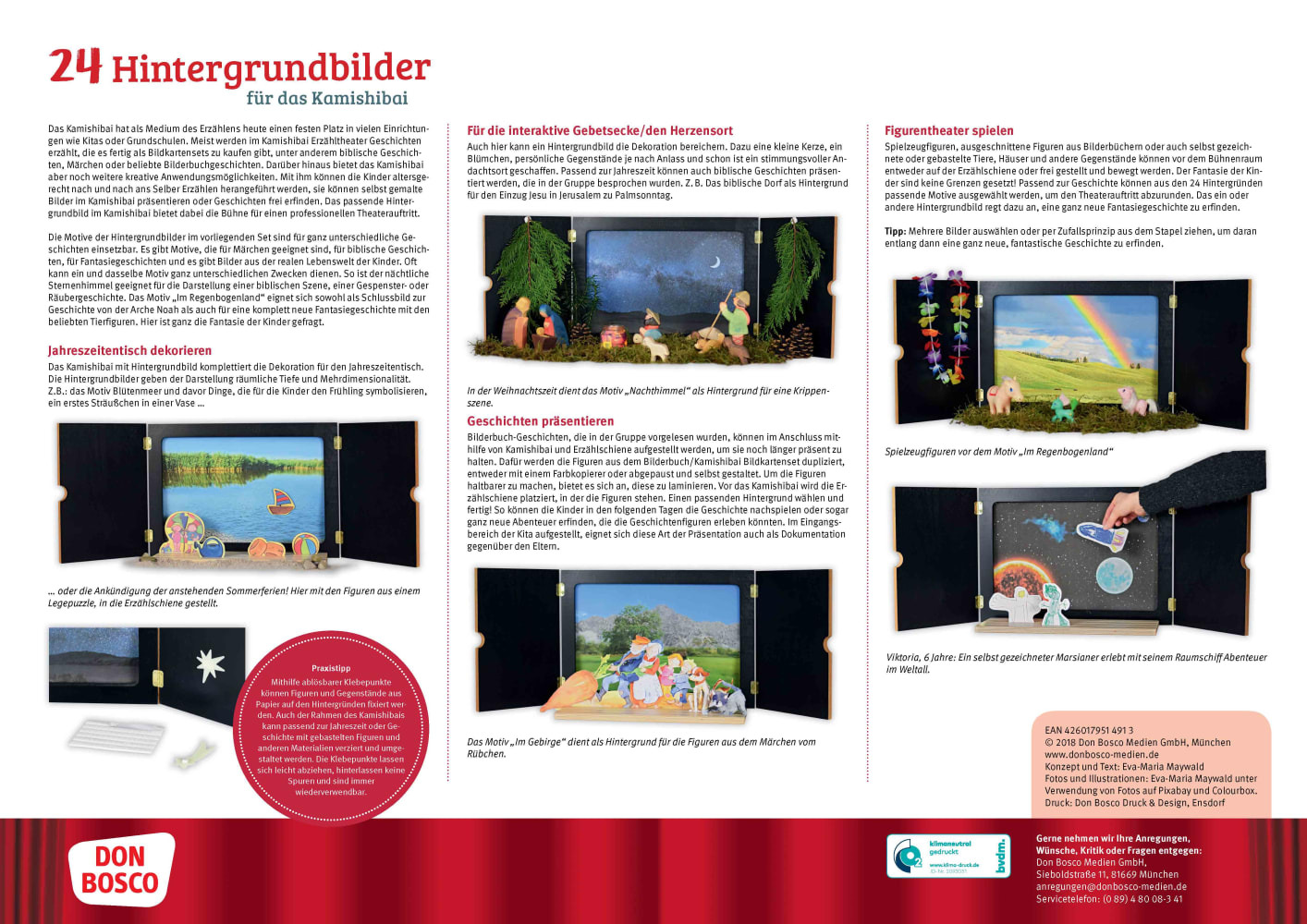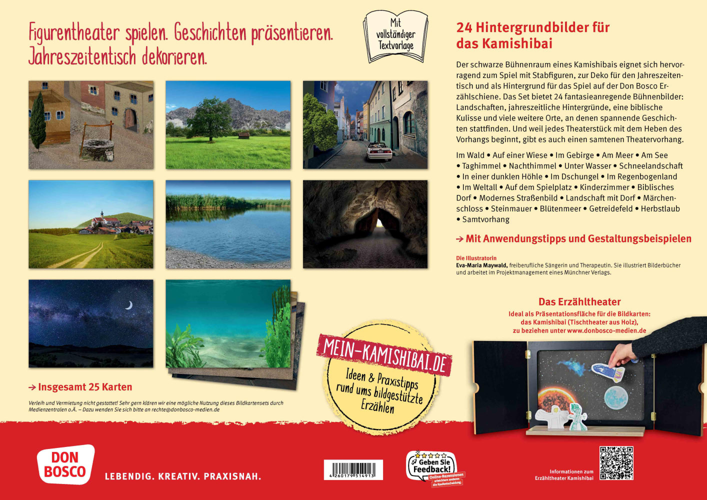 Fantasieanregende und stimmungsvolle Bühnenbilder fürs Kamishibai, die zum Spiel mit Stabfiguren, zur Deko oder als Hintergrundbild zur Erzählschiene genutzt werden. Der schwarze Bühnenraum eines Kamishibais eignet sich hervorragend zum Spiel mit Stabfiguren, ...