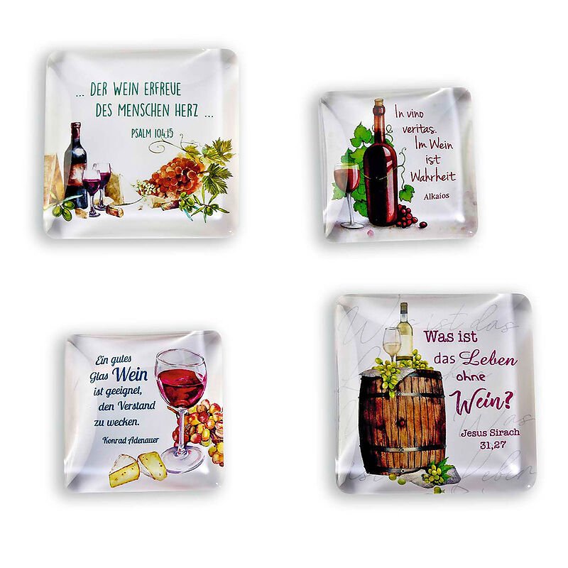 Das perfekte Geschenk für alle Weinliebhaber ist dieses einzigartige Set mit Deko-Magneten. Die vier Magnete mit der gewölbten Cabochon-Glasoberfläche sind mit unterschiedlichen Motiven und Zitaten rund um das Thema Wein gestaltet. Eine praktische wie ansehnli...