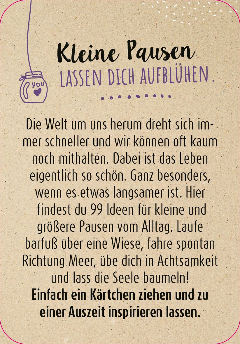 99 Ideen für kleine Pausen lassen dich aufblühen Die Welt um uns herum dreht sich immer schneller, oft können wir kaum mithalten. Dabei ist das Leben so schön. Besonders, wenn es etwas langsamer ist. In dieser Kartenbox findest du 99 Ideen für kleine und größ...