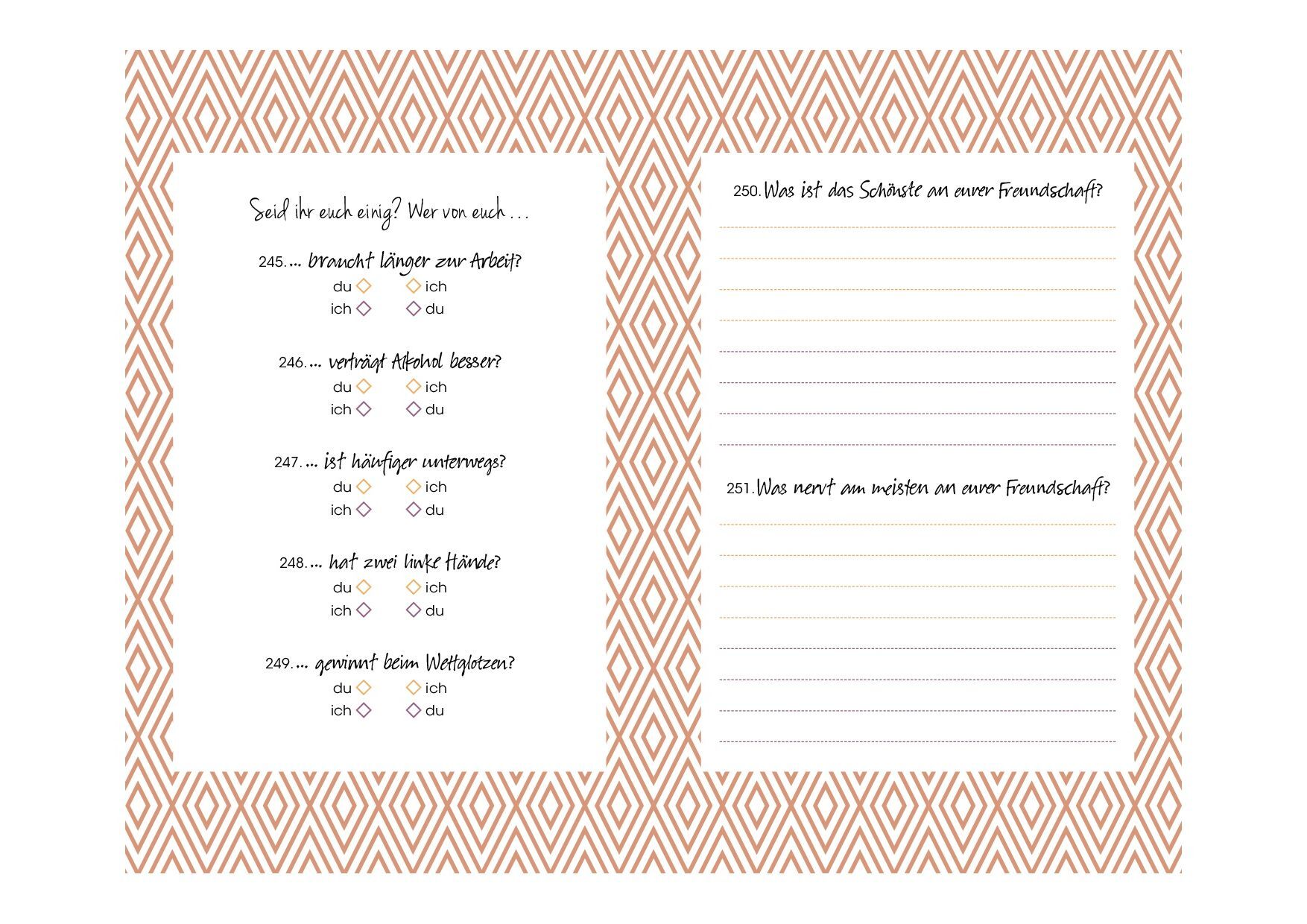 Die beste Freundin ist einer der wichtigsten Menschen man erzählt ihr nicht nur alles, sondern kennt auch ihre Geheimnisse, erträgt ihre Macken und teilt ihren Humor. Das gemeinsame Ausfüllen der 999 lustigen, ernsten, verrückten und interessanten Fragen macht...