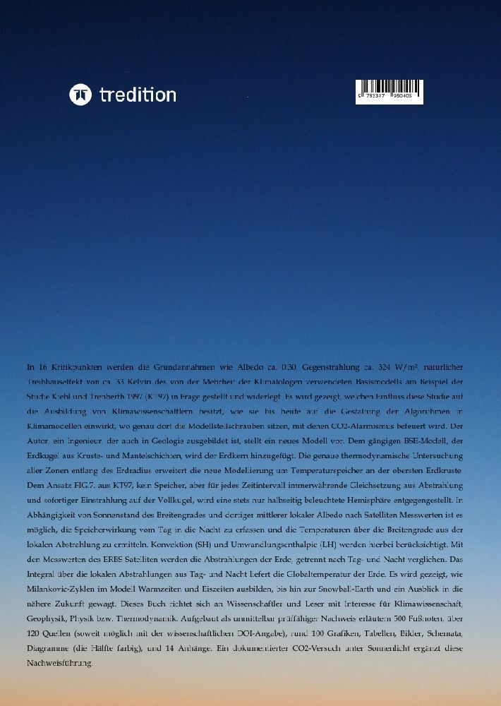 In 16 Kritikpunkten werden die Grundannahmen wie Albedo ca. 0.30, Gegenstrahlung ca. 324 W/m², natürlicher Treibhauseffekt von ca. 33 Kelvin des von der Mehrheit der Klimatologen verwendeten Basismodells am Beispiel der Studie Kiehl und Trenberth 1997 (KT97) i...