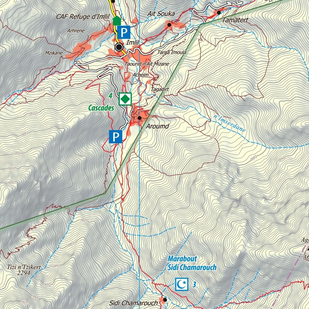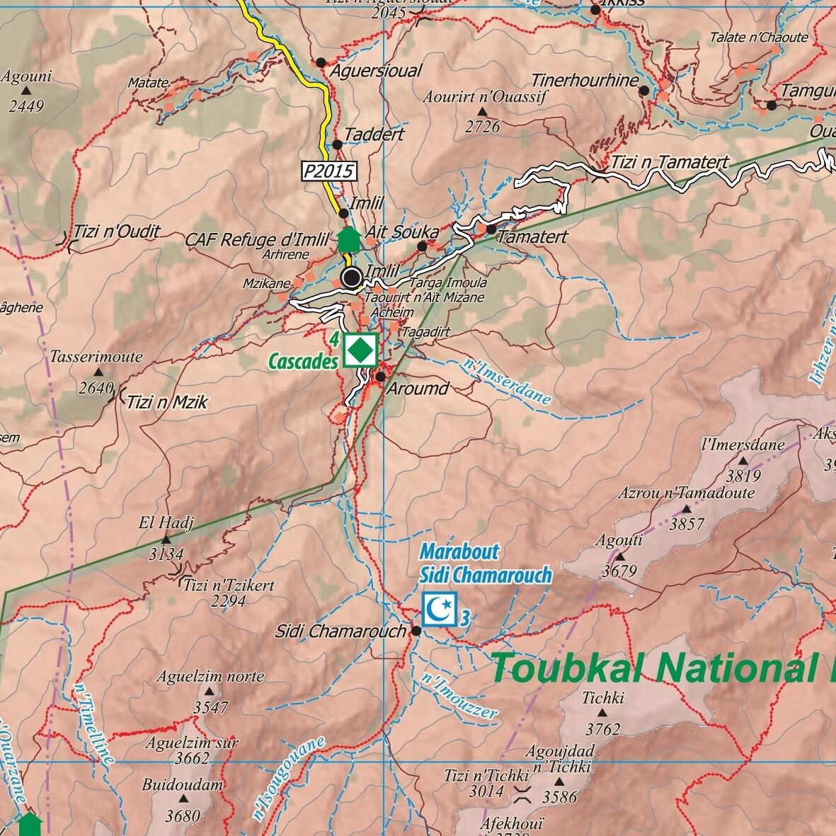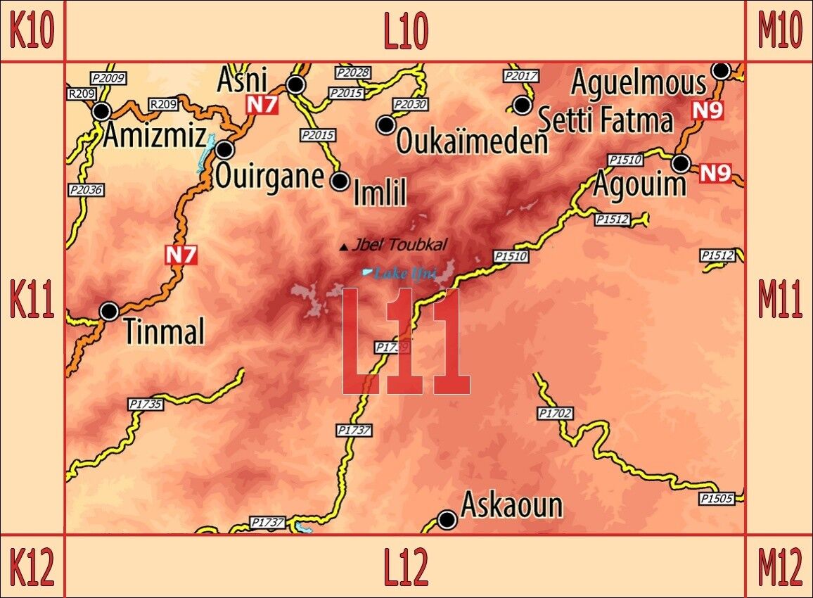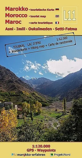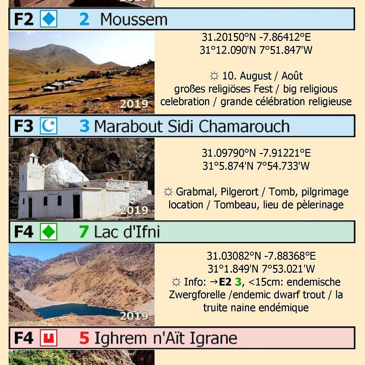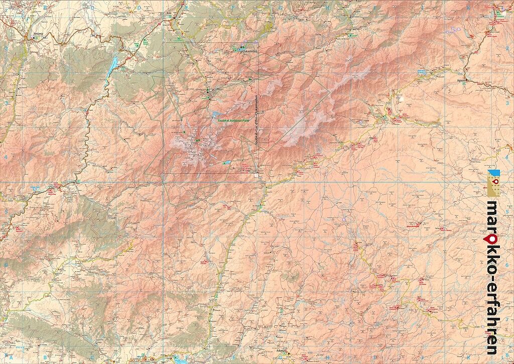 Dreisprachige (de. / en. / frz.) äußerst detaillierte touristische Landkarte / Reiseführer von Marokko mit 67 Zielen. Fast alle mit Farbfoto und Koordinatenangabe.- Baukultur: Kasbahs und Speicherburgen an N7, P1510 und P1737- Prähistorie: Dinosaurier-Spuren a...