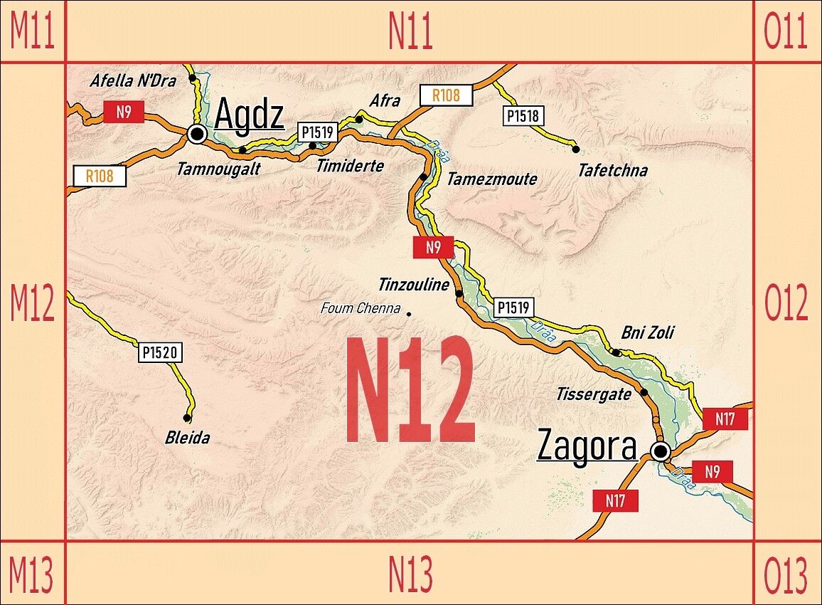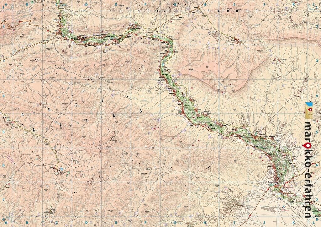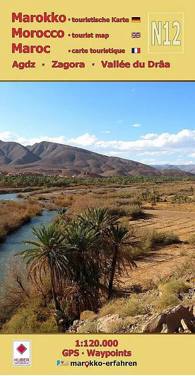 En diagonale sur la page, l'Oued Drâa serpente entouré d'une bande verte de palmiers depuis Agdz en haut à gauche jusqu'à Zagora en bas à droite. Une raison suffisante pour accrocher la feuille dépliée au mur en guise de poster ? La page de texte portera sur l...