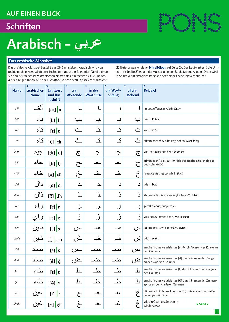 Die arabischen Schriftzeichen auf einen Blick Vorstellung des arabischen Alphabets inklusive Schreibvarianten und Hinweisen zur Aussprache. Ausführliche Erläuterungen zu den Vokal- und weiteren Zusatzzeichen. Informationen zur sprachgeschichtlichen Entwicklun...