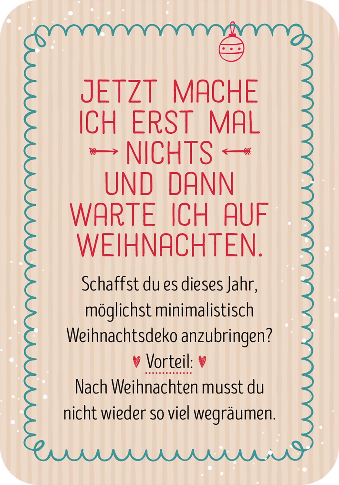 Witzige Ideen für eine entspannte Vorweihnachtszeit Dieser witzige Adventskalender im Taschenformat zeigt dir, wie du in der Weihnachtszeit unnötigen Stress vermeidest und von Tag zu Tag relaxter wirst! So kannst du dich auf das Wesentliche konzentrieren und ...