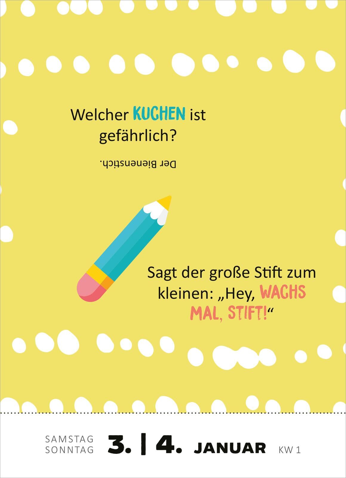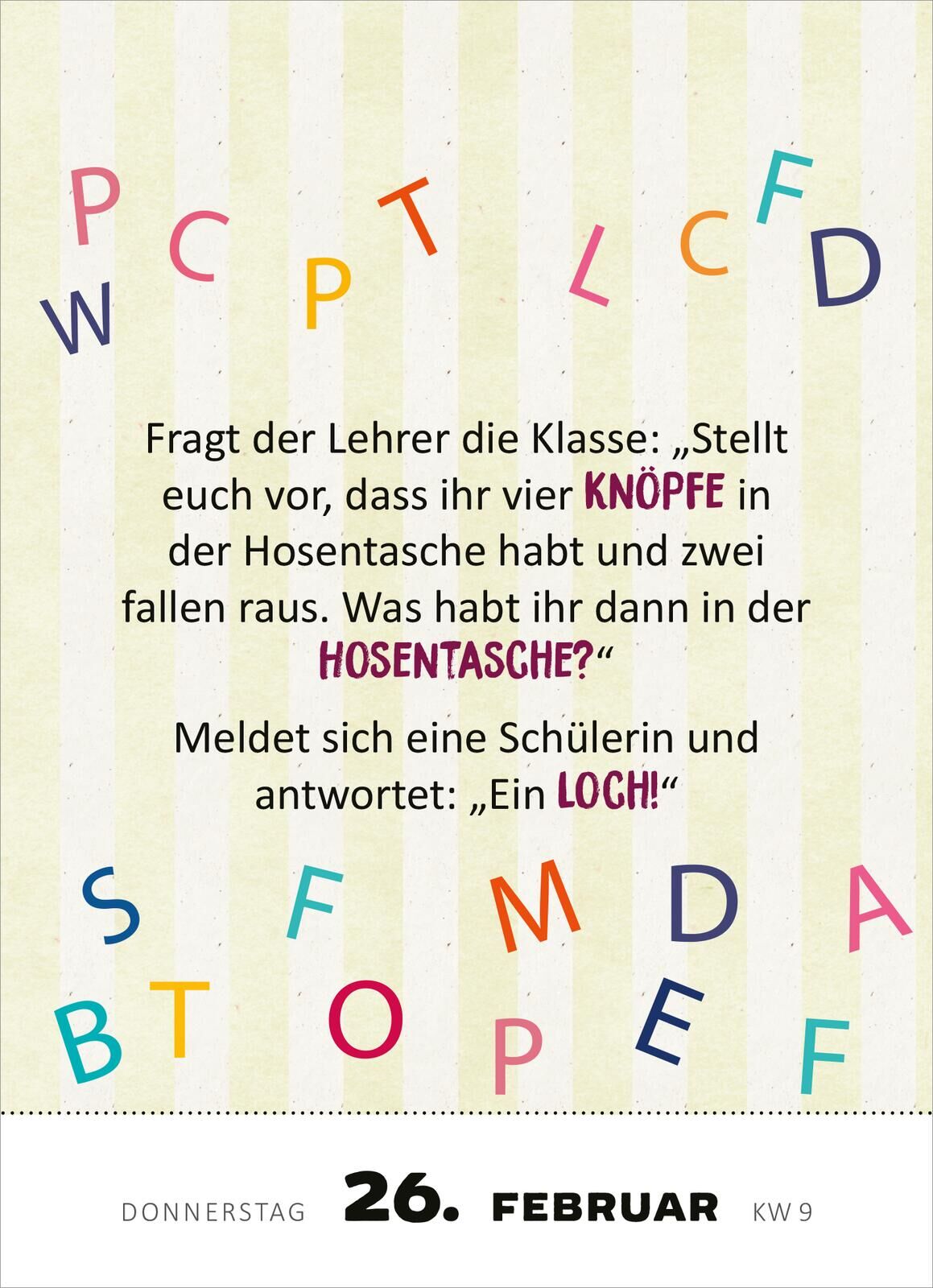 Der Tageskalender, der dich mit 365 Witzen zum Lachen bringt Dieser Abreißkalender für jeden Tag des Jahres 2026 beinhaltet 365 humorvolle Witze für große und kleine Kinder. Kurz und knackig geschrieben, sorgen die Kinderwitze jeden Tag für einen Lacher und e...