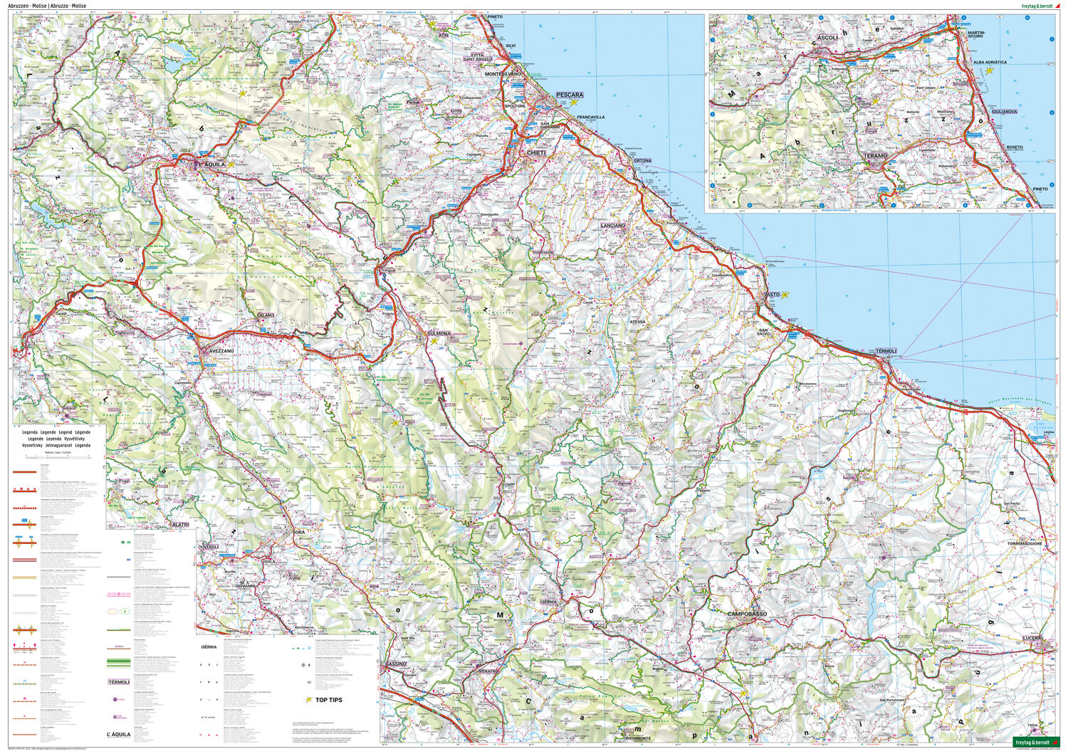 Mit der Straßenkarte Abruzzen - Molise im Maßstab 1:150.000 finden sich Urlauber die mit Auto, Motorrad oder Wohnwagen unterwegs sind bestens zurecht. Das weit verzweigte Straßennetz ist exakt abgebildet, Entfernungen und viele Ausflugsziele sind in der Karte ...