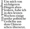 Abscheu. Politische Gedichte aus dem alten China. "Um mich von wichtigeren Dingen abzulenken, habe ich in den letzten Wochen einige antike politische Gedichte aus dem Chinesischen übersetzt. Diese werde ich nun regelmäßig unter dem Betreff 'Tagesgedicht' verse...