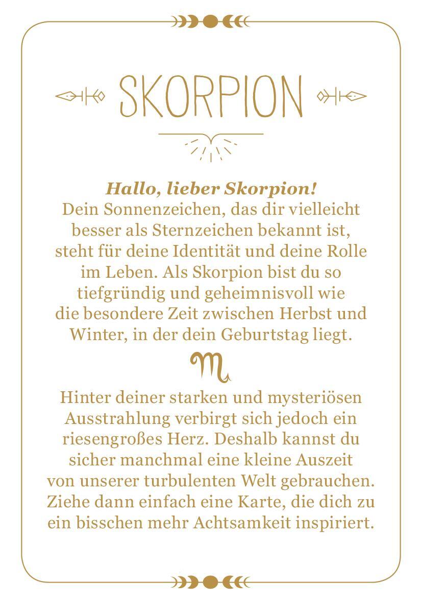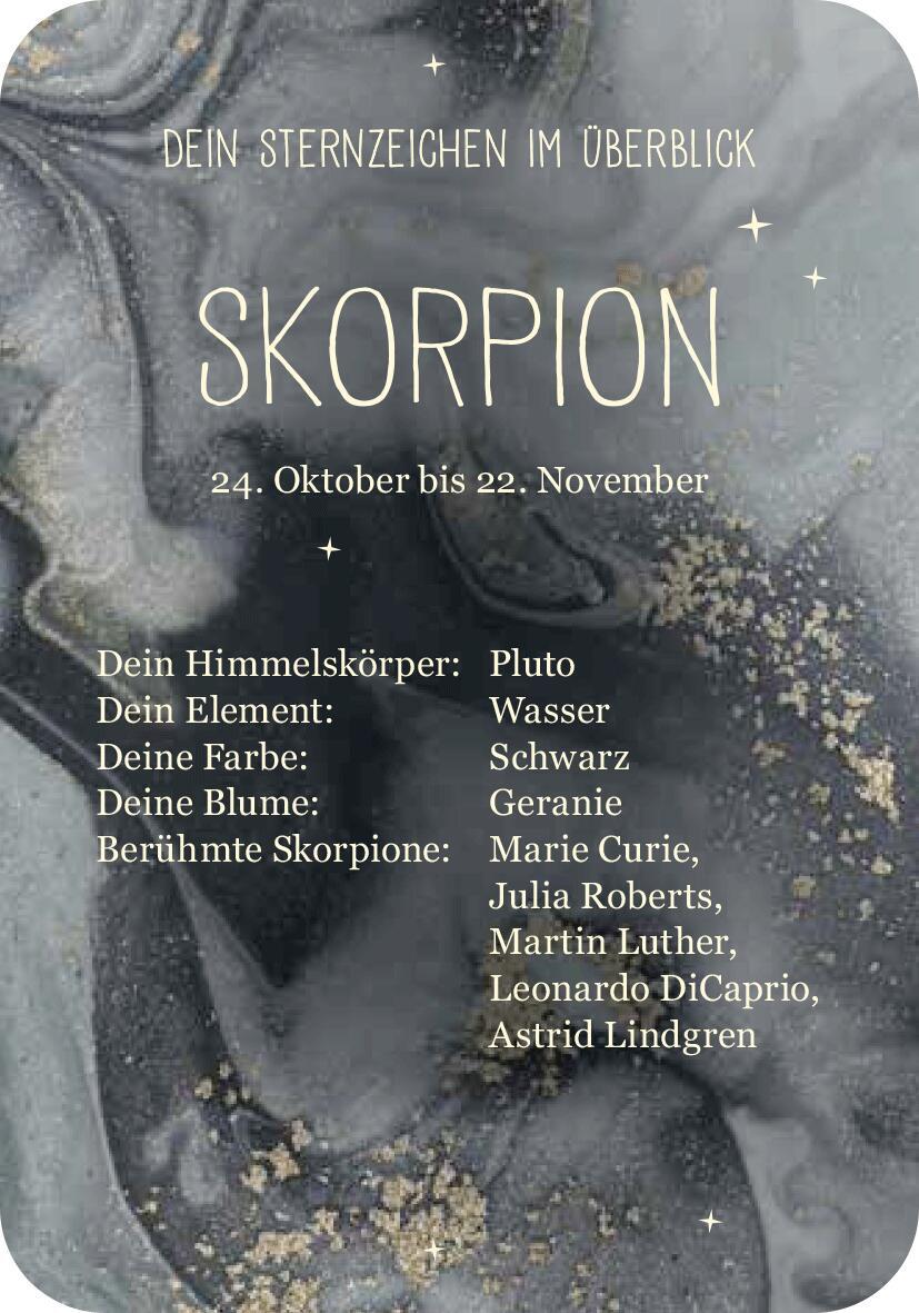 Was steht in deinen Sternen? Achtsamkeitstipps für das Sternzeichen Skorpion (24. Oktober 22. November) Wassermänner gelten als unabhängig, Schützen als optimistisch und Stiere als verlässlich doch welche Einflüsse hat dein eigenes Sternzeichen auf dich? Und ...