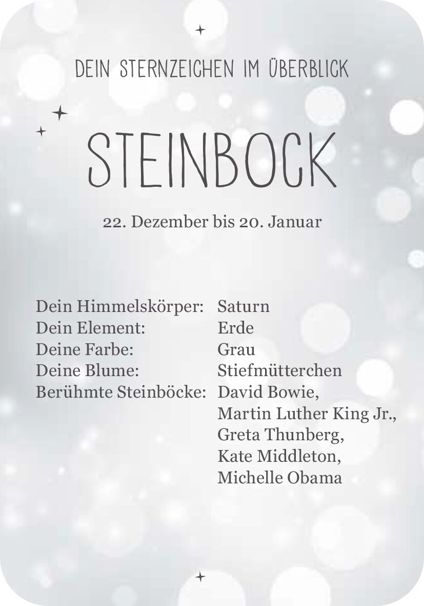 Was steht in deinen Sternen? Achtsamkeitstipps für das Sternzeichen Steinbock (22. Dezember 20. Januar) Wassermänner gelten als unabhängig, Schützen als optimistisch und Stiere als verlässlich doch welche Einflüsse hat dein eigenes Sternzeichen auf dich? Und ...