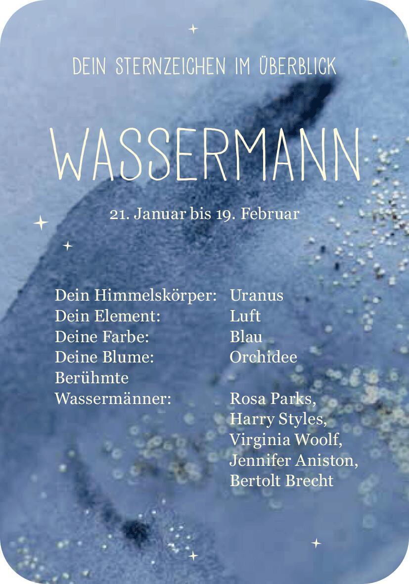 Was steht in deinen Sternen? Achtsamkeitstipps für das Sternzeichen Wassermann (21. Januar 18. Februar) Widder gelten als willensstark, Schützen als optimistisch und Stiere als verlässlich doch welche Einflüsse hat dein eigenes Sternzeichen auf dich? Und wie ...