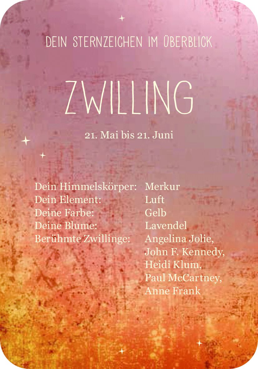 Was steht in deinen Sternen? Achtsamkeitstipps für das Sternzeichen Zwillinge (21. Mai 21. Juni) Wassermänner gelten als unabhängig, Schützen als optimistisch und Widder als willensstark doch welche Einflüsse hat dein eigenes Sternzeichen auf dich? Und wie ka...