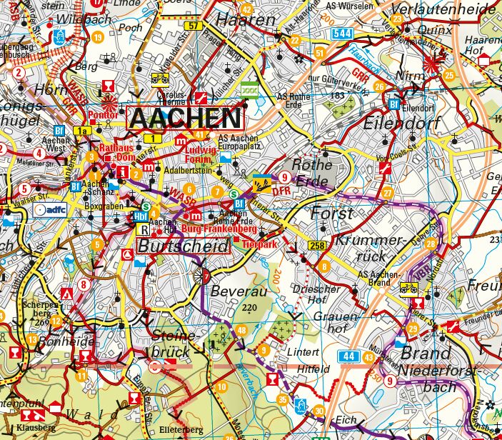 Offizielle Karte des ADFC Allgemeiner Deutscher Fahrrad-Club e.V. die ideale Karte für Planung und Durchführung von Tages- und Wochenendradtouren. Auf einem großen Gebiet von bis zu 70 x 100 Kilometern findet sich alles, was Radler brauchen. Routen, Tagestoure...