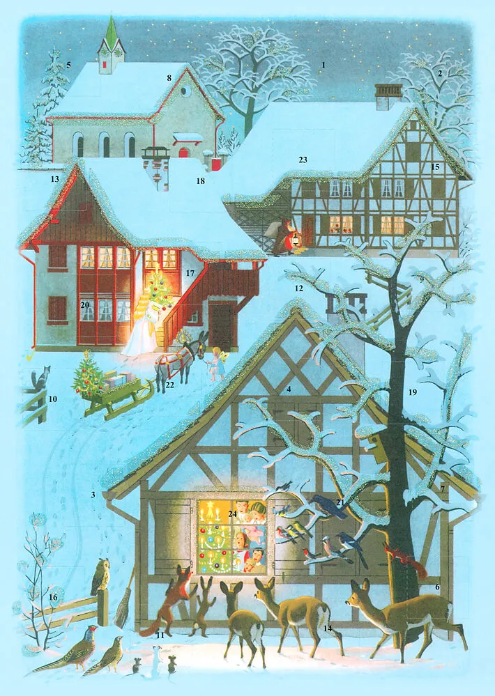 38 x 28,30cm, Hochformat farbig illustriert, mit Glimmer - Adventskalender mit dem zauberhaften Weihnachtssujets aus dem beühmten Schweizer Kinderlider-Bilderbuch Chömed Chinde, mir wänd singe" - mit 24 verschiedenen, bekannten und unbekannten Instrumenten für...