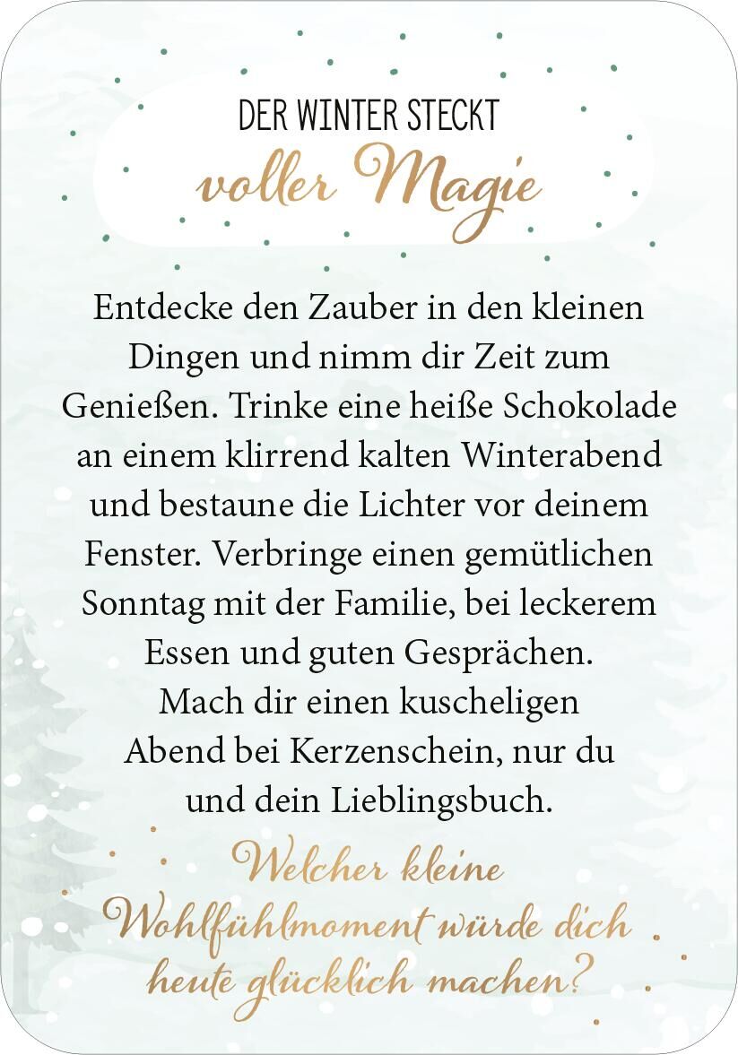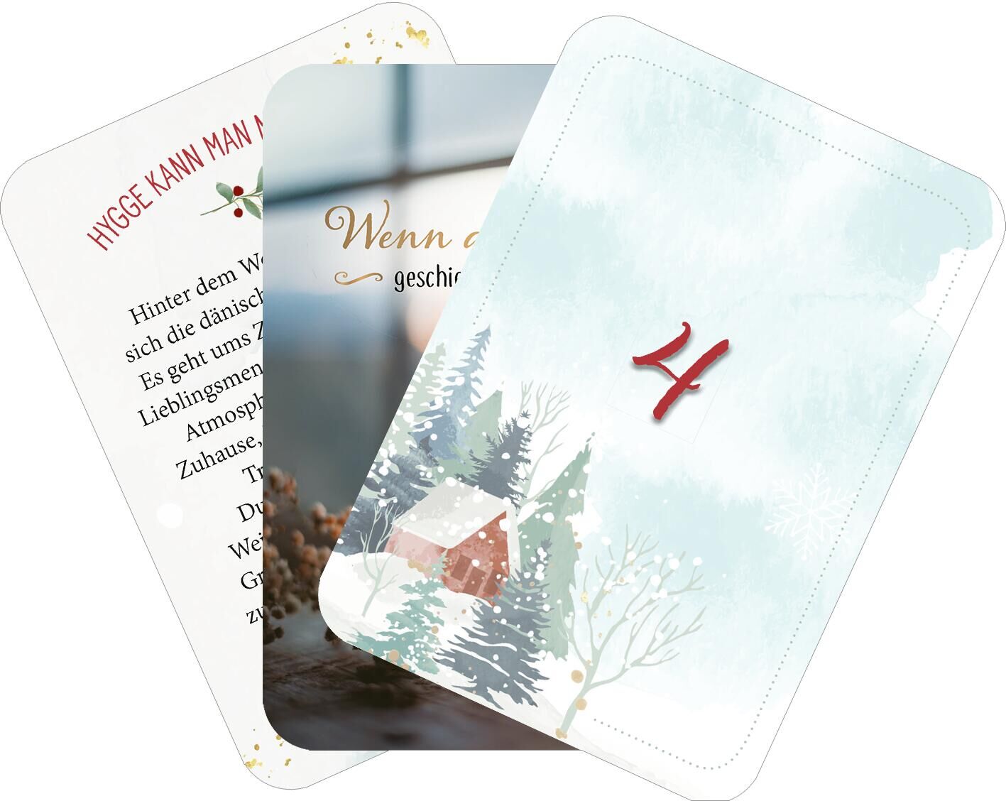 Weihnachtszauber und kleine Wohlfühlpausen für den Advent Dieser Adventskalender lässt dich die Vorweihnachtszeit so richtig genießen: Auf 24 stimmungsvollen Kärtchen findest du hyggelige Sprüche und Inspirationen für kleine Wohlfühlmomente. So bringst du meh...