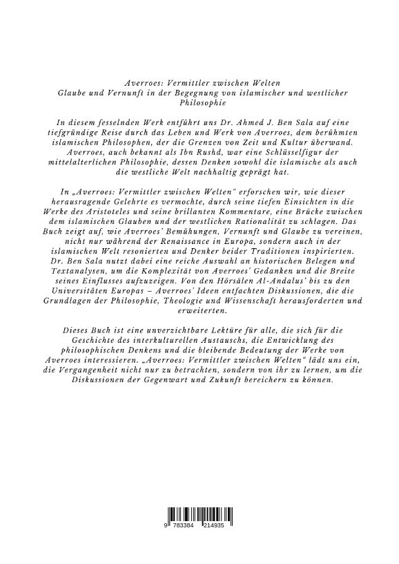 Averroes: Vermittler zwischen Welten Glaube und Vernunft in der Begegnung von islamischer und westlicher Philosophie In diesem fesselnden Werk entführt uns Dr. Ahmed J. Ben Sala auf eine tiefgründige Reise durch das Leben und Werk von Averroes, dem berühmten i...