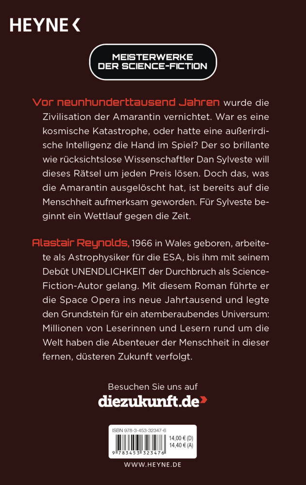Wir schreiben das Jahr 2551. Archäologe Dan Sylveste macht auf dem lebensfeindlichen Planeten Resurgam im Delta-Pavonis-System eine ungeheure Entdeckung: Eine hochtechnisierte Zivilisation, die Amarantin, lebte einst hier, doch bevor sie die bemannte Raumfahrt...