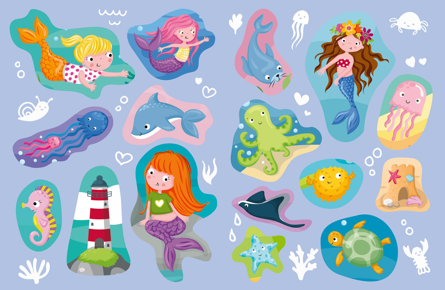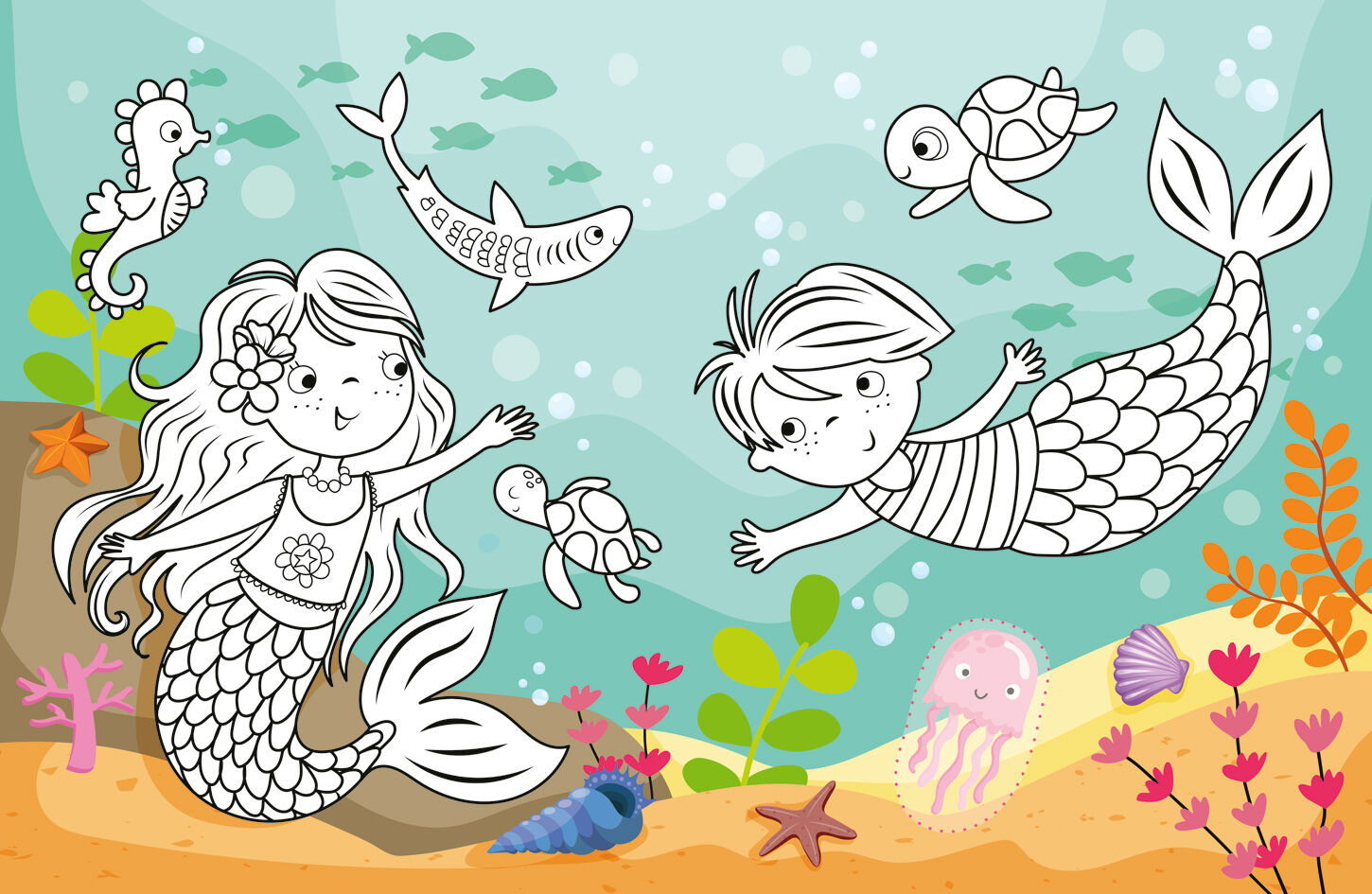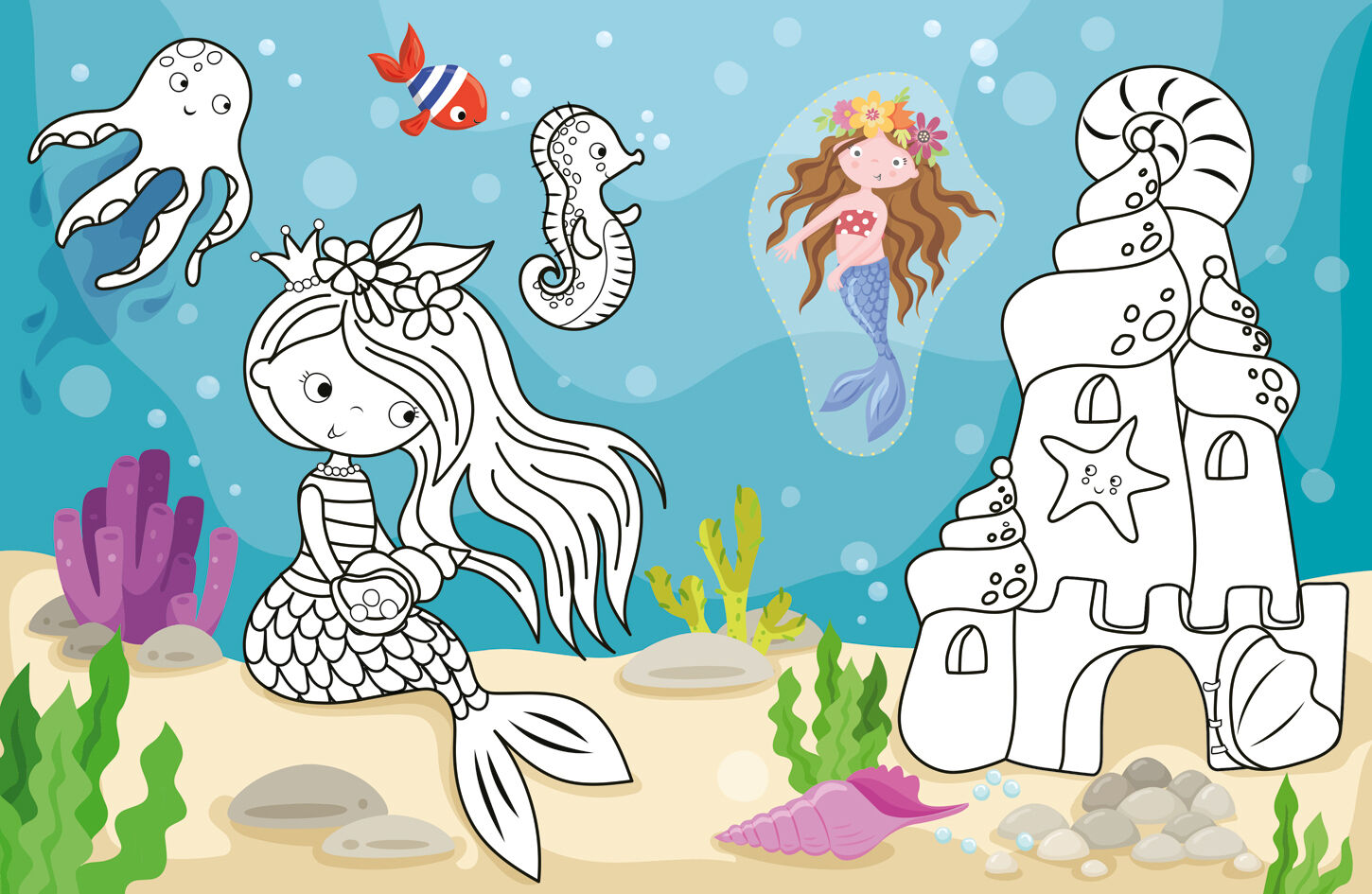 Bezaubernde Meerjungfrauen, bunte Fische, niedliche Schildkröten und viele weitere hübsche Motive lassen die Unterwasserwelt lebendig werden. Der Hintergrund ist farbig, die Nixen und ihre tierischen Freunde können mit Buntstiften und den zugehörigen Stickern ...