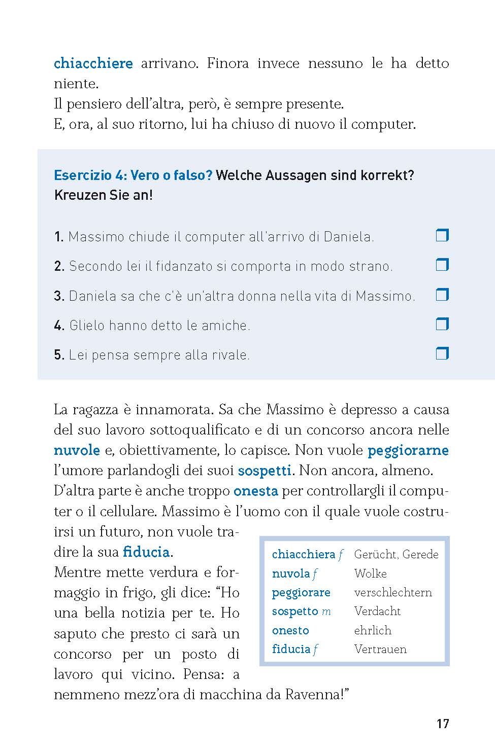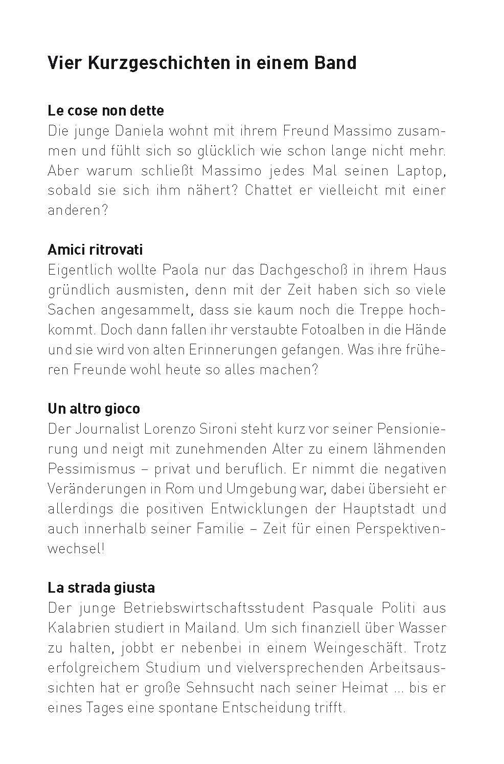 Sie lernen gerade Italienisch und möchten Ihre Sprachkenntnisse verbessern oder vorhandenes Wissen auffrischen? Sie wollen dabei unterhalten werden und Wissenswertes zu Land und Sprache erfahren? Sie lieben fesselnde Geschichten und wollen authentische Texte von muttersprachlichen Autorinnen lesen? Dann sind unsere Sprachwelten genau das Richtige für Sie. In Le cose non dette erwarten Sie vier kurzweilige Geschichten, die speziell für geübte Italienisch-Anfängerinnen ab dem Niveau A2 geschrieben wurden. Mit dem einzigartigen Lernkonzept erweitern Sie spielerisch Ihre Sprachkompetenzen. Tauchen Sie in die italienische Sprachwelt ein und verbessern Sie ganz nebenbei Ihren Wortschatz und vertiefen Sie Ihre Grammatikkenntnisse. Es gibt auch viel Wissenswertes rund um Land und Leute zu entdecken. Die speziell konzipierten, thematischen Übungen verbinden sich mit unterhaltsamer Lektüre und sorgen schnell für Erfolgserlebnisse. So geht Sprachenlernen!