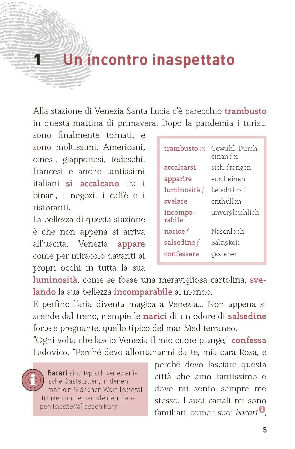 Kommissarin Nicoletti bringt ihren Freund Ludovico Lombardo zum Zug am Bahnhof von Venedig: Seine Mutter geht es gesundheitlich nicht gut und sie braucht Hilfe. Auf dem Bahngleis wird die Kommissarin so heftig angerempelt, dass sie beinahe auf das Gleis fällt....Kommissarin Nicoletti bringt ihren Freund Ludovico Lombardo zum Zug am Bahnhof von Venedig: Seine Mutter geht es gesundheitlich nicht gut und sie braucht Hilfe. Auf dem Bahngleis wird die Kommissarin so heftig angerempelt, dass sie beinahe auf das Gleis fällt. So ein Rüpel! denkt Rosa Nicoletti verärgert und geht nach Hause. Umso erstaunter ist sie am nächsten Morgen, dass sie genau die Person, die sie einen Tag vorher angerempelt hat, in ihrem Büro wiedersieht: Der junge Mann stellt sich als der neue Kommissar vor, der ihr aus Mailand geschickt wird, denn seit Wochen kommt sie in einer Reihe von mysteriösen Morden älterer Männer und Frauen nicht weiter. Ob die Zusammenarbeit mit ihm erfolgreich wird und sie den mysteriösen Mördern auf die Spur kommen? Ein spannender, mitreißender Krimi, der den Leser bis zum Schluss in seinen Bann zieht. Die bewährte Reihe Lernkrimi wird für Fortgeschrittene Niveau B1 endlich fortgesetzt! Alle für B1 schwierigen Wörter werden beim ersten Auftreten in Vokabelkästen direkt auf der Seite übersetzt und Infokästen liefern zusätzliche Informationen zu Landeskunde und sprachliche Eigenheiten. Am Ende des Bandes befinden sich ein Abschlusstest mit Lösungen und das alphabetische Glossar. Die Vokabeln kann man mit der Vertonung bei phase6 lernen und die Aussprache überprüfen.