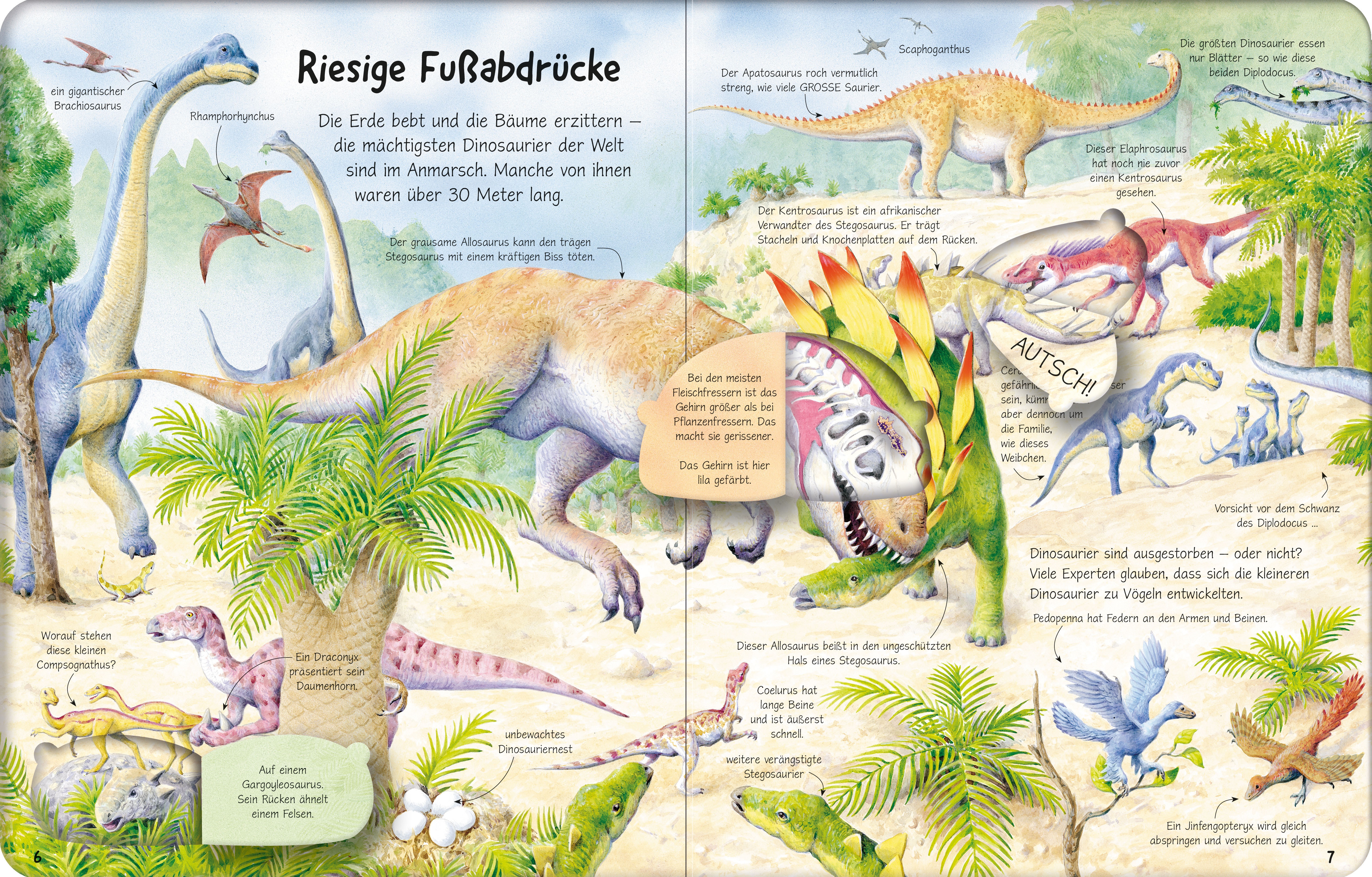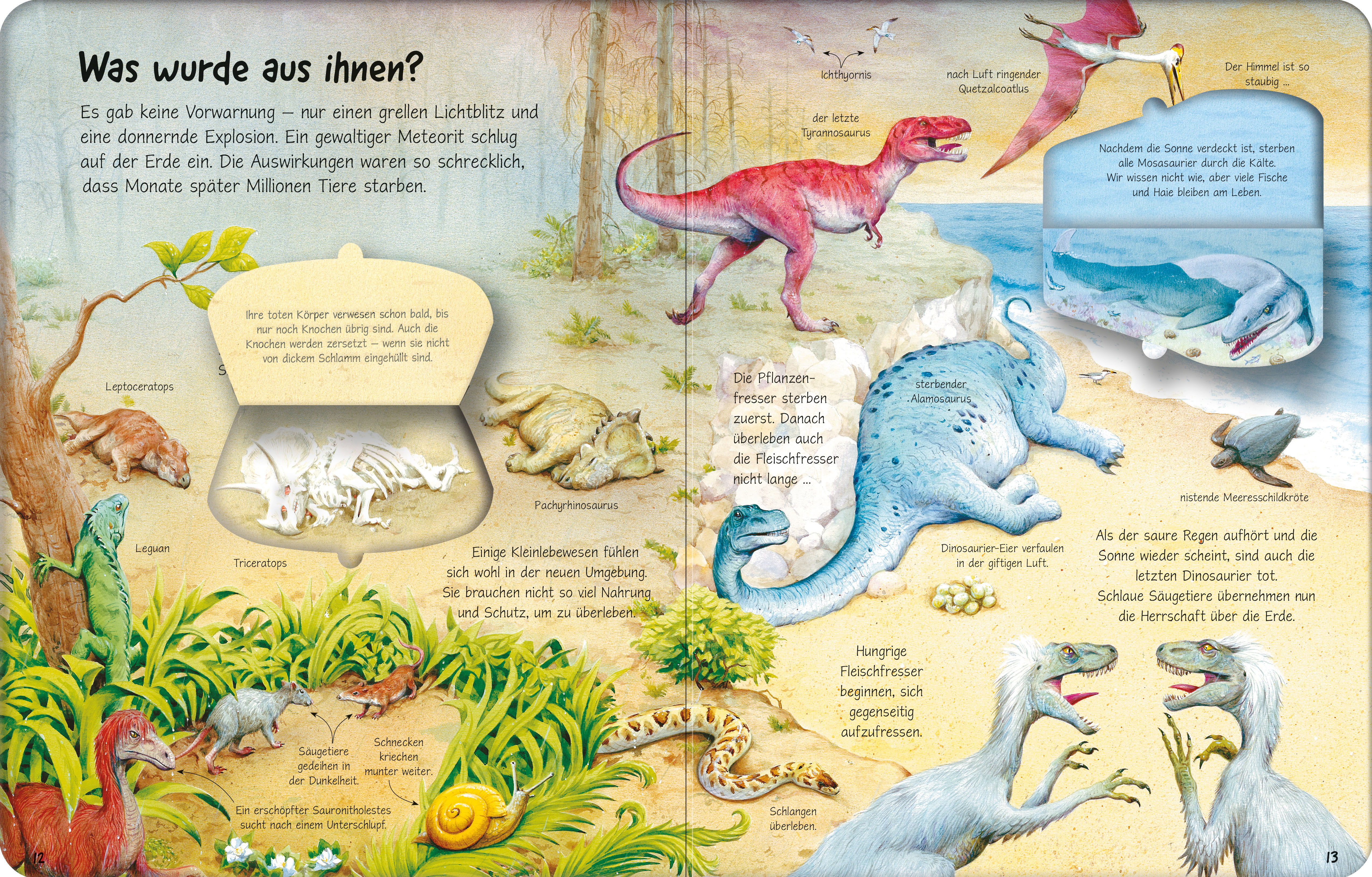 Unter 65 Klappen finden Dino-Fans die Antworten auf viele spannende Fragen zu den Urzeitriesen. Wie lang waren die längsten Dinosaurier? Wie schützten sich langsame Styracosaurier vor Feinden? Was geschah mit den Urzeitriesen und woher wissen wir heutzutage s...