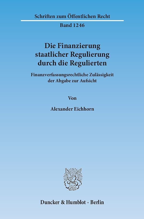 Die Finanzierung der Gesamttätigkeit einer Regulierungsbehörde durch Abgaben, die von den der Regulierung unterworfenen Marktteilnehmern als Gruppe nach dem Kostendeckungsprinzip entrichtet werden, gilt für den Gesetzgeber mittlerweile als selbstverständlich. ...Die Finanzierung der Gesamttätigkeit einer Regulierungsbehörde durch Abgaben, die von den der Regulierung unterworfenen Marktteilnehmern als Gruppe nach dem Kostendeckungsprinzip entrichtet werden, gilt für den Gesetzgeber mittlerweile als selbstverständlich. Zudem verleitet dieses den Fiskus schonende Abgabenkonzept zur Okkupation immer neuer Gebiete, gerade im Regulierungsverwaltungsrecht. Dabei stellt sich vor dem Hintergrund der finanzverfassungsrechtlichen Anforderungen an nichtsteuerliche Abgaben allerdings stets die Grundsatzfrage nach der Verteilung von Aufgaben- und Finanzierungsverantwortung zwischen Staat und Wirtschaft. Alexander Eichhorn entwickelt einen vom Abgabenbegriff losgelösten Ansatz zur Begrenzung von Kostenüberwälzungen im sogenannten Kernbereich staatlicher Regulierungstätigkeit. Dabei erkennt er nach einer Betrachtung der Rechtsprechung des Bundesverfassungsgerichts zu Sonderabgaben mit Finanzierungsfunktion eine Finanzierungsverantwortung der Marktteilnehmer bei Vorliegen einer typischen Gefahrensituation in Gestalt eines Versagens der Marktmechanismen in regulierten Sektoren. Bei der abschließenden Anwendung seiner Lösungskonzeption auf die Finanzierung der Bundesnetzagentur und der Bundesanstalt für Finanzdienstleistungsaufsicht wird deutlich, dass letztlich nur diejenige Regulierungstätigkeit umlagefähig ist, die sich gegenwärtig nach ökonomischen Wertungsmaßstäben als notwendig zur Beseitigung der konkreten Form des Marktversagens darstellt. Damit grenzt sich der Autor von der Rechtsprechung ab, die dazu neigt, eine Finanzierungsverantwortung bereits dann zu bejahen, wenn das zu finanzierende Regulierungsregime dem Ziel der Kompensation von Marktversagen dient.