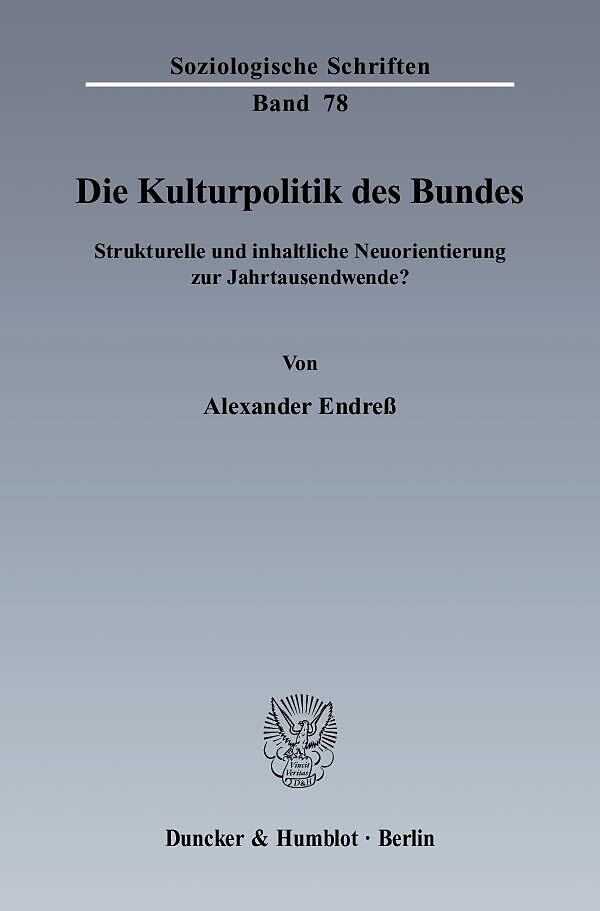 Alexander Endreß setzt sich erstmalig auf umfangreiche theoretische und empirische Weise mit dem Feld der Kulturpolitik auf der Bundesebene auseinander. Anlass dieser vom Autor als Soziologische Politikanalyse bezeichneten Arbeit war die Einführung des Amtes eines "Beauftragten der Bundesregierung für Angelegenheiten der Kultur und Medien" im Jahr 1998. Dieser Akt wurde von Bundeskanzler Gerhard Schröder als ein maßgeblicher Schritt zur Neuorientierung der Bundeskulturpolitik bezeichnet, wobei immer unklar blieb, wie sich die konkrete politische Arbeit dieses Staatsministers bzw. dieser Staatsministerin denn gestalten sollte. Die Basis bildet die Ausarbeitung eines theoretischen Ansatzes zur Operationalisierung konkreter kulturpolitischer Funktionalität. Dieser Ansatz stützt sich zum einen auf struktur-funktionale Grundüberlegungen und auf Erkenntnisse der Sozialanthropologie und markiert somit das "typisch Soziologische" der Arbeit. Anhand dieser Gegenwartsdiagnose sollen gleichzeitig Erkenntnisse über die Funktionalität kultureller Subsysteme als Teile des gesamtgesellschaftlichen Systems gewonnen werden, die in Zukunft durchaus in die kulturpolitische Praxis implementiert werden könnten. Die empirische Basis stellt eine Inhaltsanalyse von Pressemitteilungen und Budgetdaten dar, anhand derer die Aktivitäten dieser umstrittenen Behörde transparent und letztlich auch beurteilbar werden. Insgesamt bietet der Verfasser einen großen Einblick in die Entwicklung der Kulturpolitik des Bundes nach 1945 und in die gegenwärtige politische Praxis.