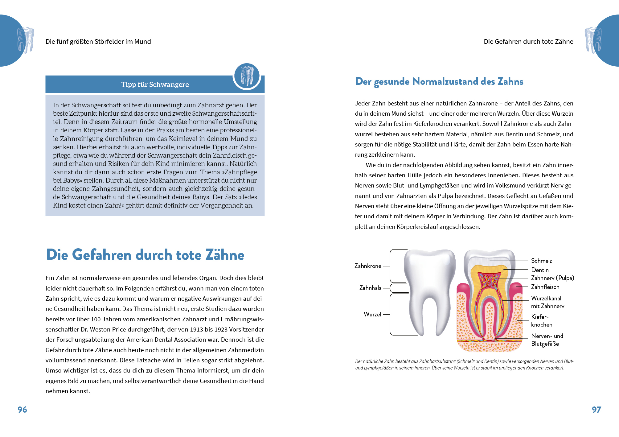 • Tote Zähne fördern das Bakterienwachstum, da im Zahninneren giftige Stoffwechselprodukte entstehen, die sich über den Blutkreislauf im ganzen Körper verteilen. Die Folge können Herzinfarkt, Schlaganfall, Diabetes Typ 2, Darm- und Nervenerkrankungen und vieles mehr sein.
