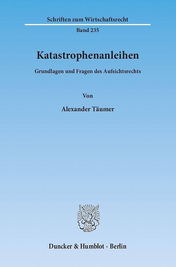 Inhaltsübersicht: Einleitung - 1. Teil: Juristische und wirtschaftliche Grundlagen: § 1 Versicherbarkeit von Naturkatastrophen: Versicherungstechnische Bewertung - Entwicklung der Naturkatastrophenereignisse und ihrer Schadenhöhen - Volkswirtschaftliche Bedeutung der Versicherung - Kapitalmarkt als Träger von Katastrophenrisiken - § 2 Insurance Linked Securities: Insurance Linked Securities als Ausprägung des Alternativen Risiko Transfers - Formen des Insurance Linked Securities - § 3 Strukturen einer Katastrophenanleihe-Transaktion: Emission von Katastrophenanleihen - Ausgestaltung von Katastrophenanleihen - § 4 Wirtschaftliche Motive der Hauptakteure: Risikoträger - Investoren - 2. Teil: Aufsichtsrechtliche Beurteilung: § 5 Versicherungsaufsichtsrechtliche Fragestellungen: Finanzaufsicht - Steuerung der Solvabilität - Auswirkungen im Bereich der Kapitalanlage - Risikomanagement - Solvency II - Emission als versicherungsfremde Tätigkeit - Investoren als Versicherer - Versicherungs-Zweckgesellschaft - § 6 Bank- und wertpapieraufsichtsrechtliche Fragestellungen: Genehmigungserfordernis nach § 32 KWG - Ausübungsüberwachung nach dem WpHG - Ergebniszusammenfassung - Literaturverzeichnis - Stichwortverzeichnis