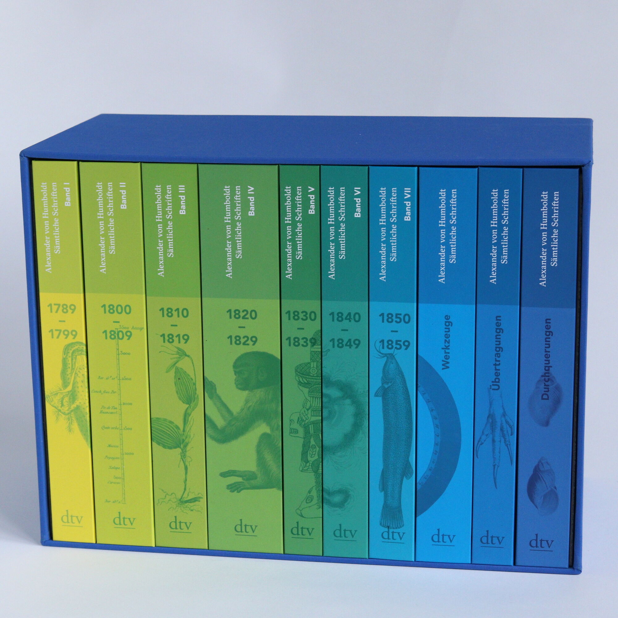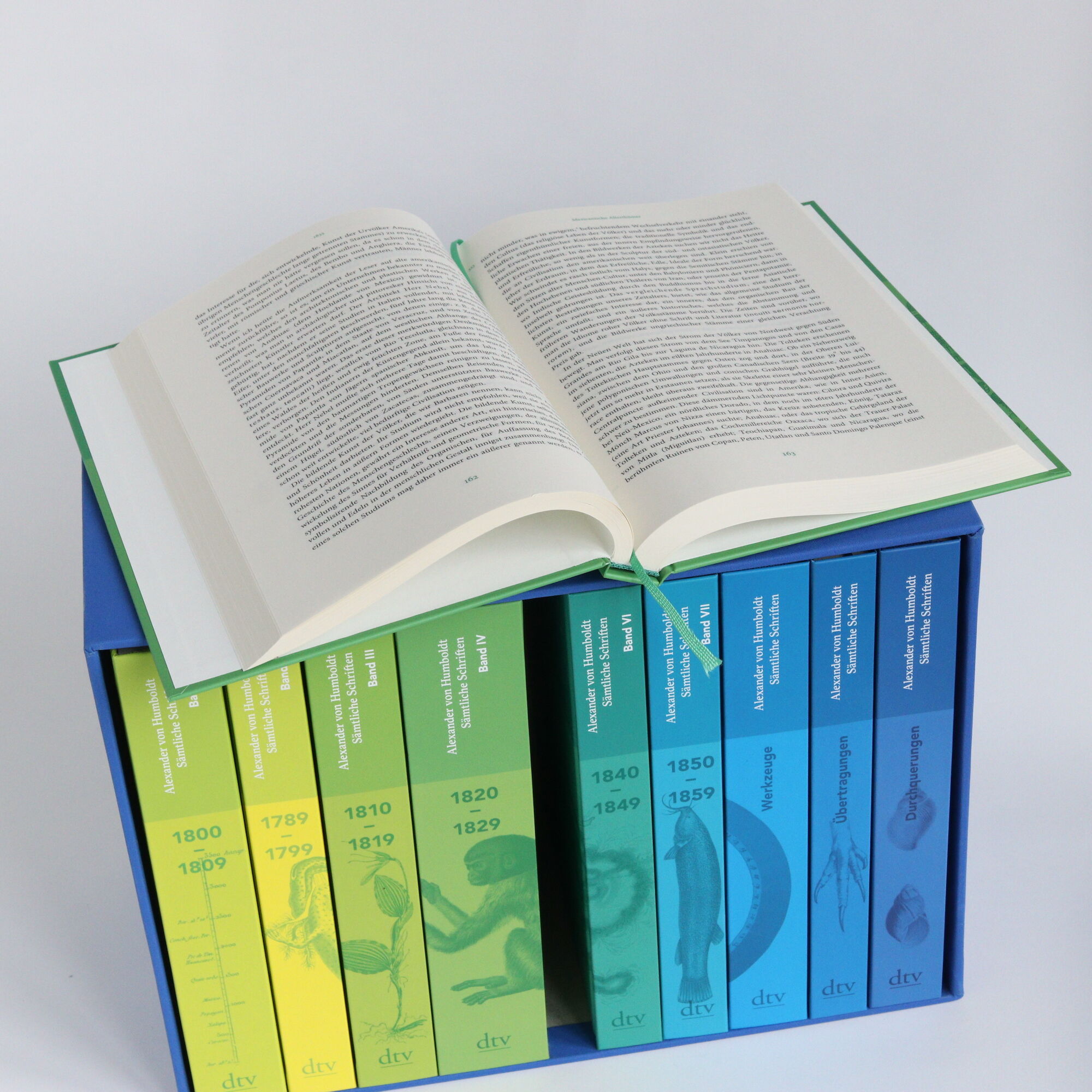 Die Studienausgabe der „Sämtlichen Schriften" Alexander von Humboldts erscheint in sieben Text- und drei papierbezogenen Kommentarbänden in einem papierbezogenen Schmuckschuber. Die Groß-Oktav-Bände im Format 17 x 24 sind in der Minion gesetzt, zweifarbig auf holzfreiem und alterungsbeständigem Werkdruckpapier gedruckt, in Fadenheftung stabil gebunden und enthalten ein Lesebändchen.