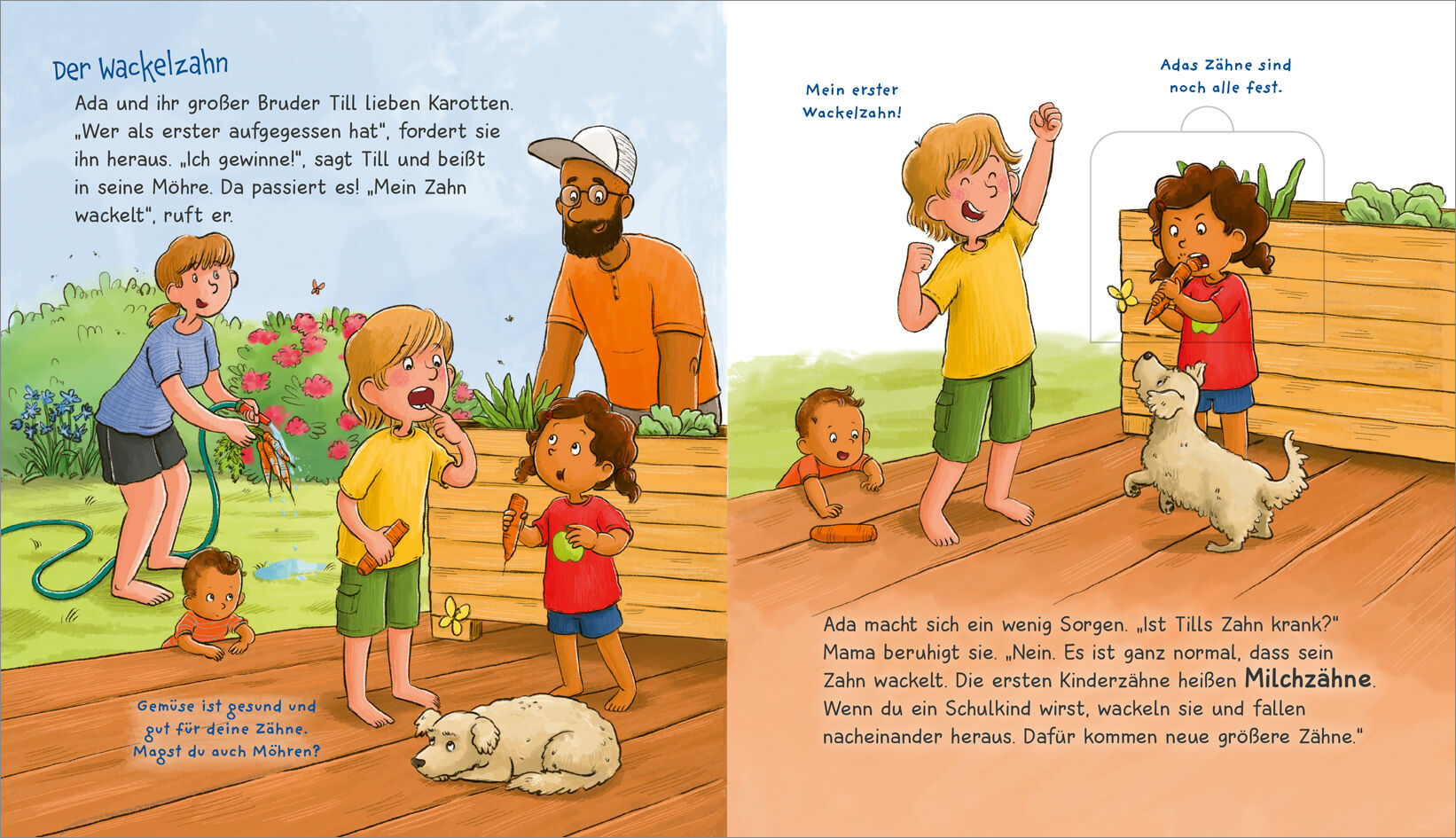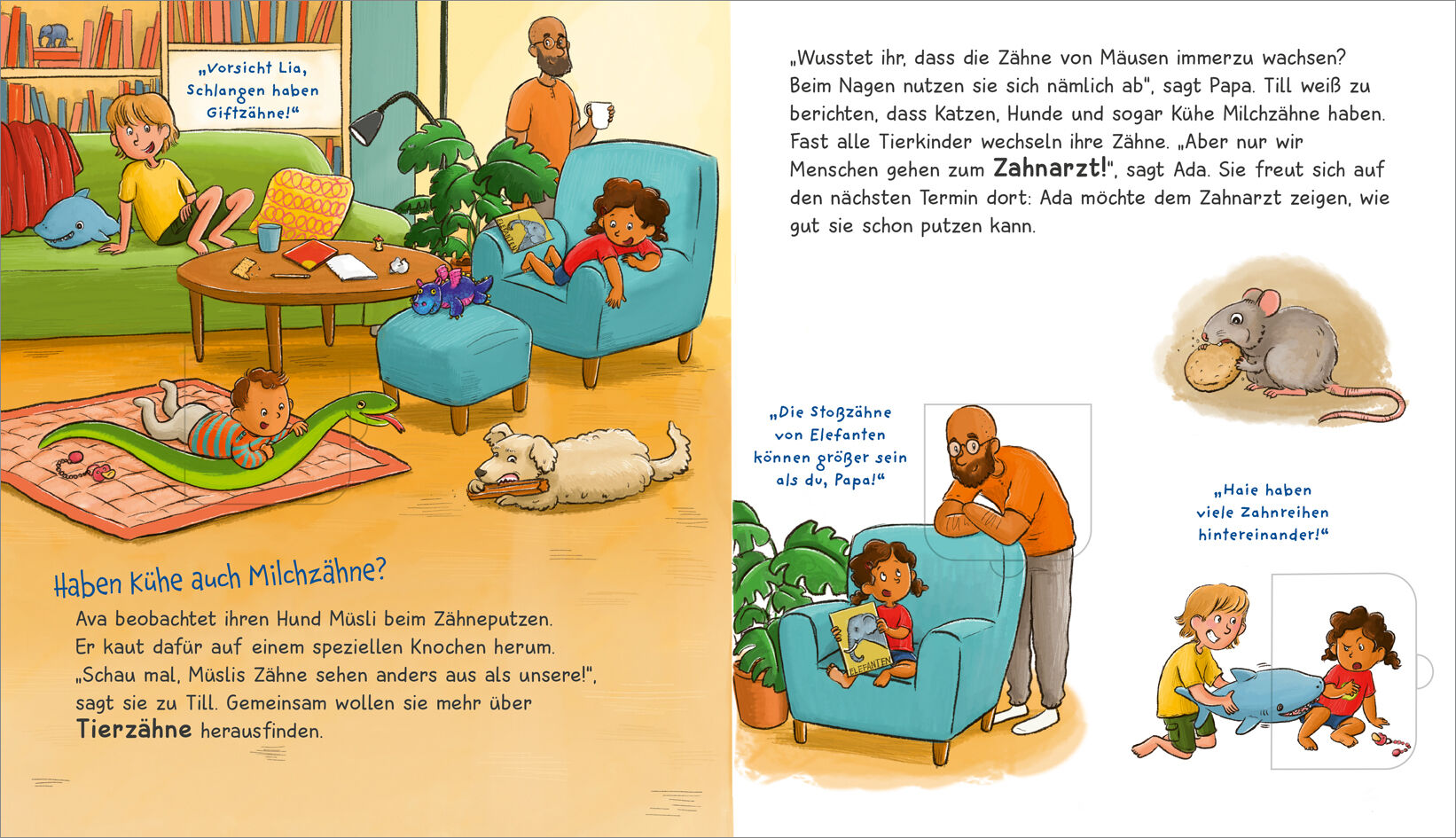 Bitte lächeln! Auf dem Familienfoto kann man jede Menge Zähne erkennen. Die von Baby Lia wachsen gerade. Till hat einen Wackelzahn, in Opas Mund glitzert ein Goldzahn und der Familienhund hat richtig scharfe Zähne. Die Geschwister Ada und Till wollen alles übe...