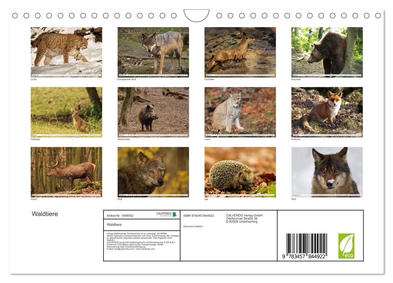 Waldtiere lautet der Titel des schönen Fotokalenders der Fotografin Alexandra Hollstein. Zu sehen sind Aufnahmen von Luchs, Fuchs, Wolf, Bär, Fischotter, Igel und Hirsch