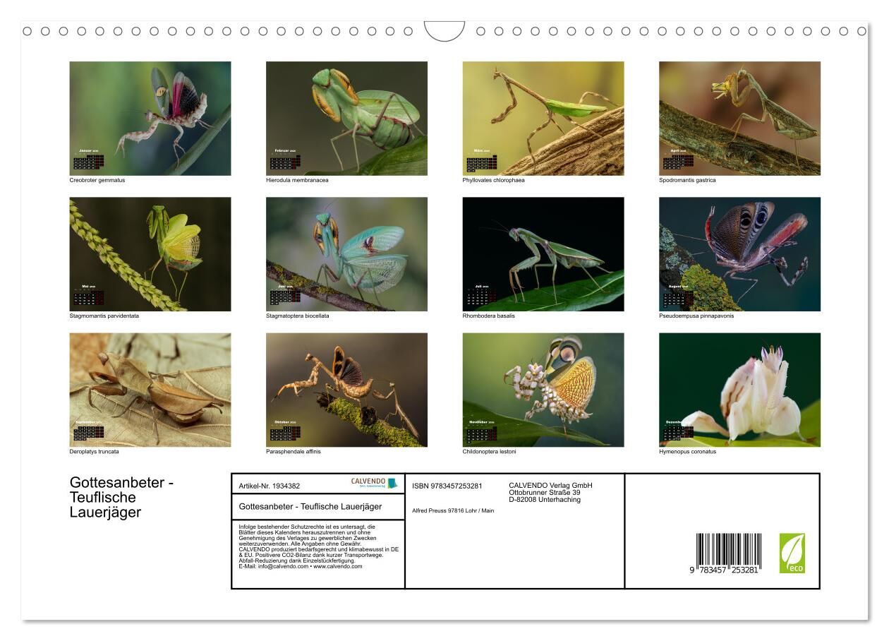 Ein Kalender mit Mantisarten ist eine faszinierende Möglichkeit, die Vielfalt und Schönheit dieser Insekten das ganze Jahr über zu entdecken. Gottesanbeterinnen gehören zu den beeindruckendsten Insekten, die durch ihre räuberische Lebensweise, die auffällige K...