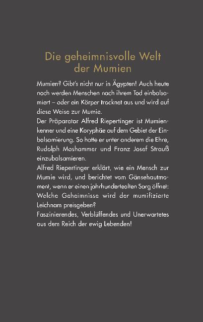 Mumien? Gibt's nicht nur in Ägypten! Auch heute noch werden Menschen nach ihrem Tod einbalsamiert und gar nicht so selten trocknet ein Körper aus und wird auf diese Weise zur Mumie. Der Präparator Alfred Riepertinger ist Mumienkenner und eine Koryphäe auf dem ...