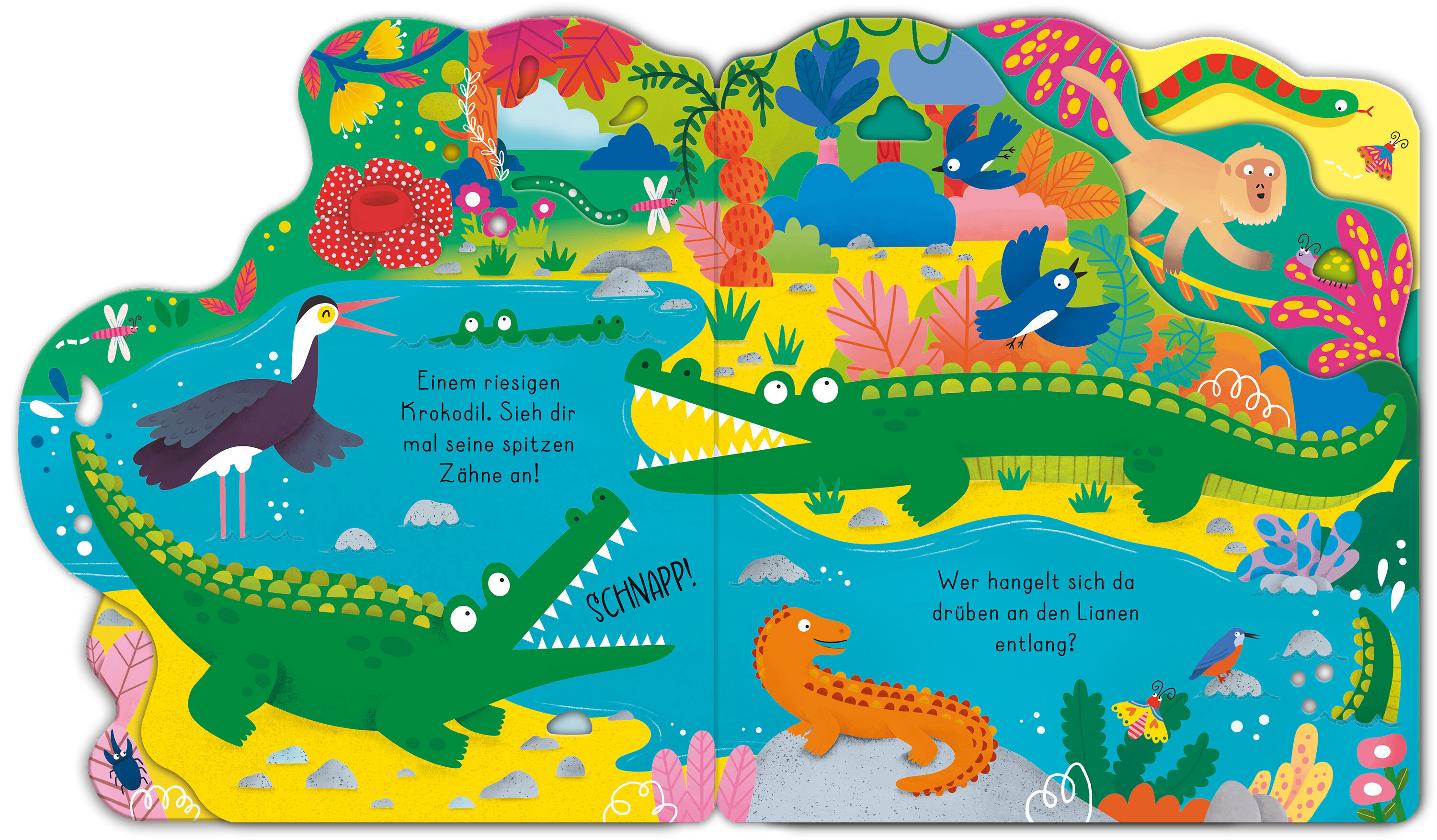 In diesem Buch entdecken Kinder viele lustige Tiere, die im Dschungel zu Hause sind. Gepunktete Leoparden, badende Elefanten, verspielte Affen und viele mehr sind unterwegs. Die besonders geformten Seiten erleichtern das Umblättern für kleine Hände. Wer ist im...