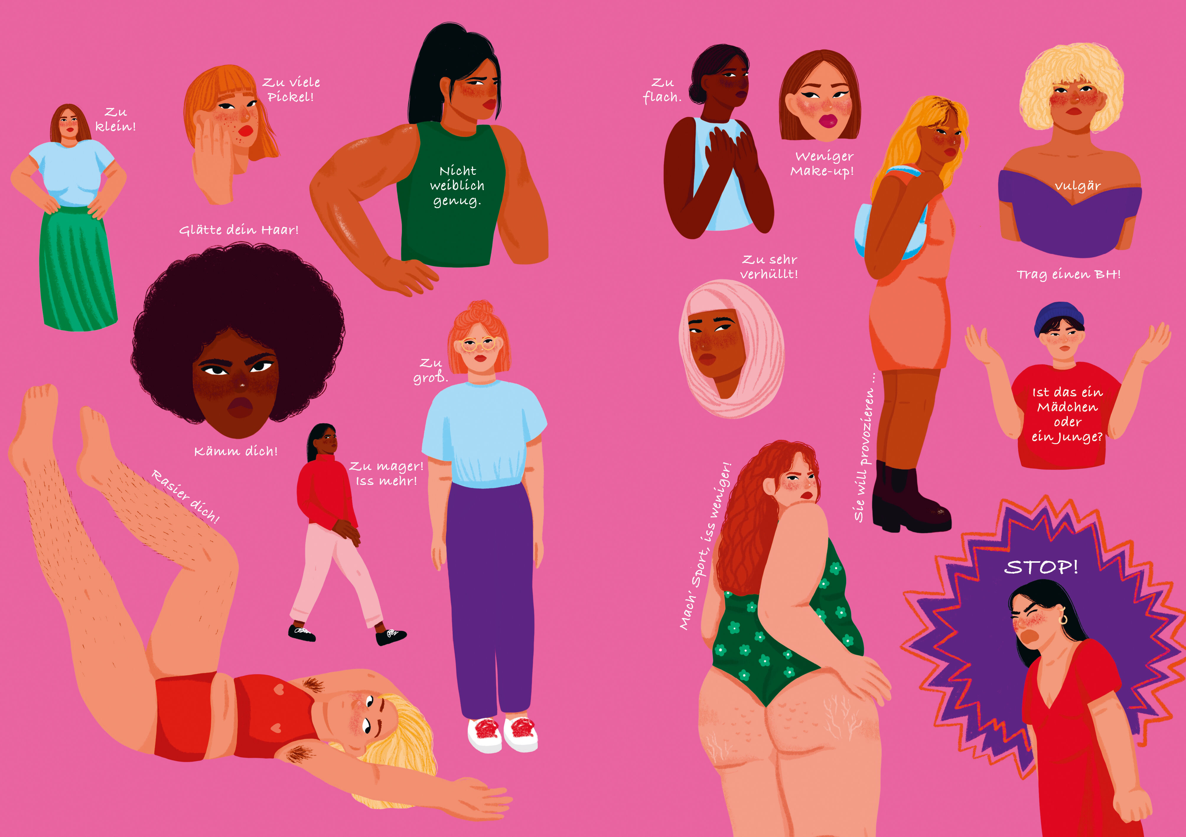 Es geht um Themen wie Menstruation, Armut, Bodyshaming, männliche Privilegien, Zugang zu Bildung, Zwangsheirat, Genitalverstümmelung, sexuelle Belästigung, Femizide und vieles mehr. Jede Geschichte wird durch einen dokumentarischen Teil ergänzt, der über Hintergründe informiert und Initiativen und Aktivistinnen vorstellt, die sich für mehr Gleichberechtigung und Frauenrechte einsetzen.