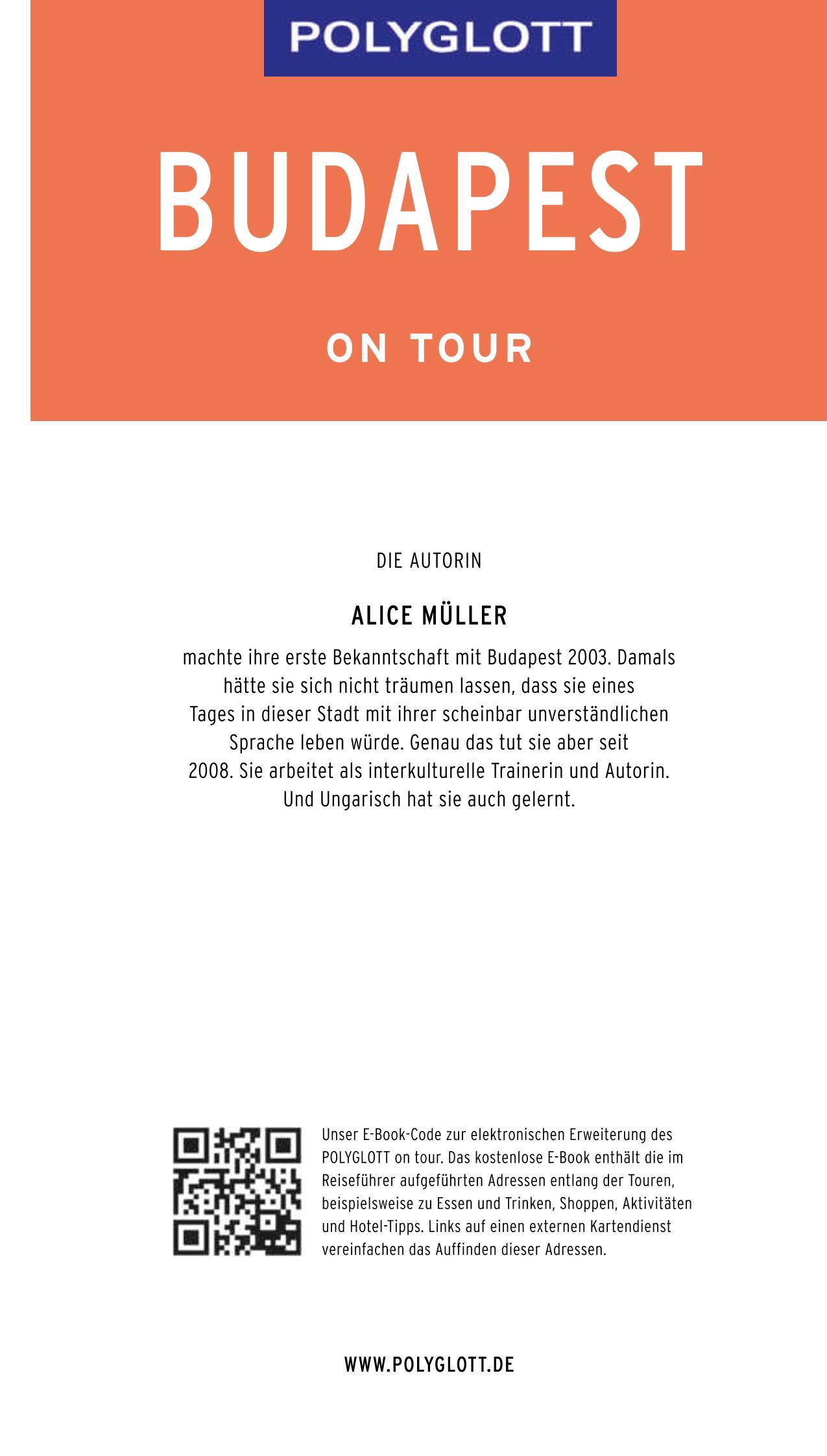 Persönlich & mittendrin! Entspanntes und unabhängiges Reisen mit dem Reiseführer POLYGLOTT on tour Budapest, der Sie direkt ins Leben der Locals eintauchen lässt. Die Autorin Alice Müller führt auf 15 abwechslungsreichen Touren zu spannenden und außergewöh...