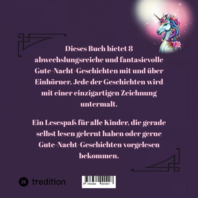 Dieses Buch bietet 8 abwechslungsreiche und fantasievolle Gute-Nacht-Geschichten über und mit Einhörnern. Jede Geschichte ist mit einer ansprechenden eigenen Illustration bebildert. Autorentext Ich habe selbst 2 Töchter und liebe es, mir Geschichten auszudenke...