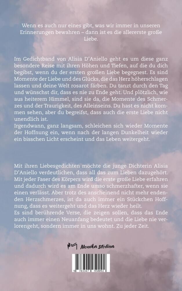 Wenn es auch nur eines gibt, was wir immer in unseren Erinnerungen bewahren dann ist es die allererste große Liebe. Im Gedichtband von Alisia D'Aniello geht es um diese ganz besondere Reise mit ihren Höhen und Tiefen, auf die du dich begibst, wenn du der erste...