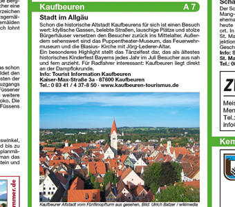 Die Radkarte Allgäu führt durch die wunderschöne Landschaft der Voralpen. Die märchenhafte Landschaft Ludwigs II. wird bestimmt von sehenswerten Städte wie Kempten, Füssen, Kaufbeuren oder Wangen und den zahlreichen Seen. Auch wenn hier im Voralpenland starke ...