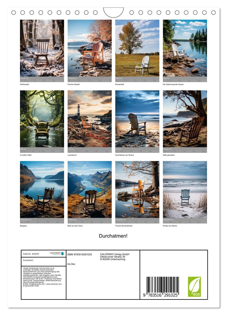 Erleben Sie das ultimative Gefühl von Ruhe und Entspannung mit diesem einzigartigen Kalender "Durchatmen!". Dieser besondere Kalender wurde für alle geschaffen, die einen Moment der Erholung und inneren Frieden suchen, die Sehnsucht nach einem stillen Rückzugs...