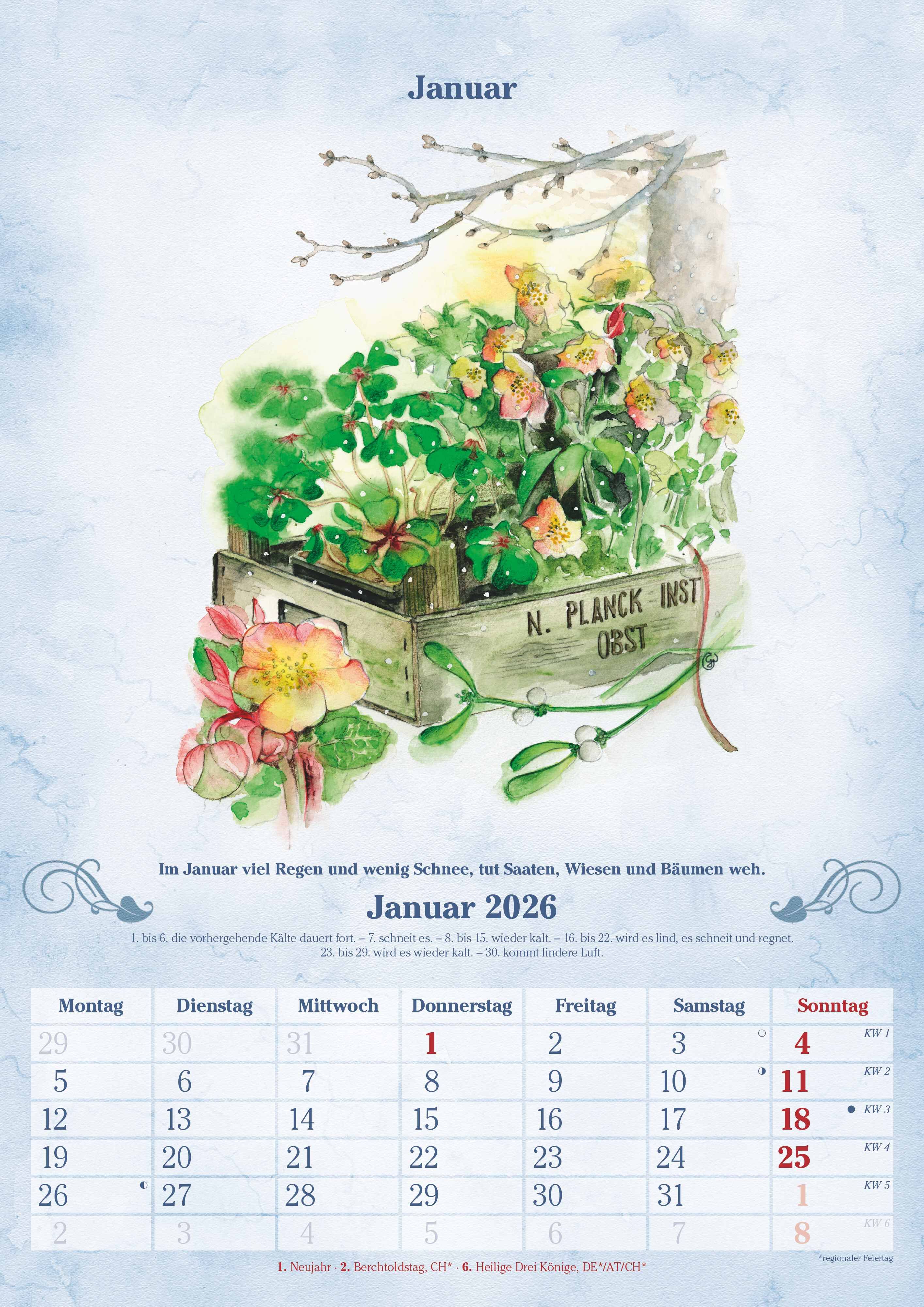 Der Alpha Edition 100-jähriger Kalender 2026 ist ein charmant gestalteter Wandkalender im A3-Format, der praktische Wettervorhersagen mit traditioneller Bauernweisheit verbindet. Monat für Monat erhalten Sie im deutschsprachigen Kalendarium eine Wetterprognos...