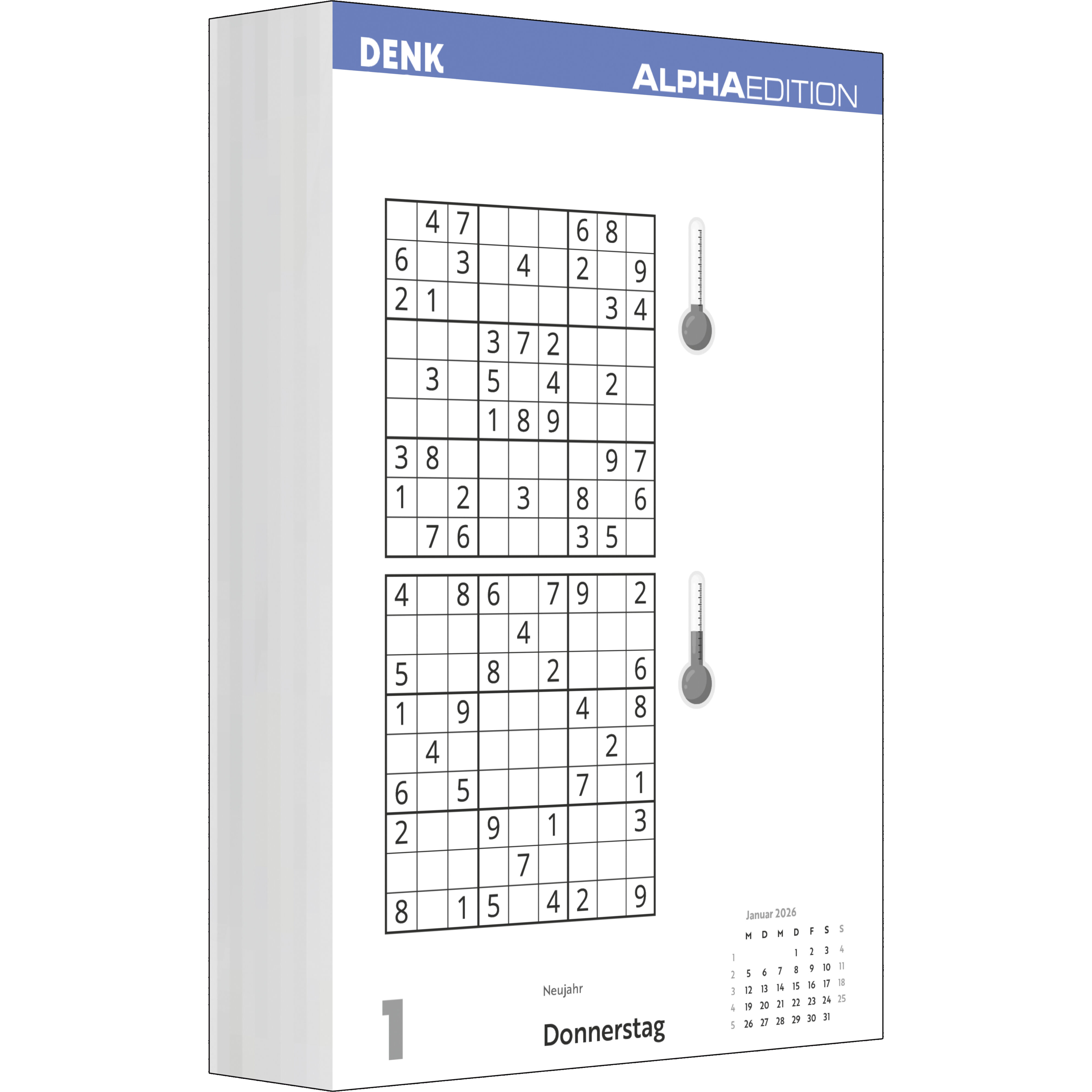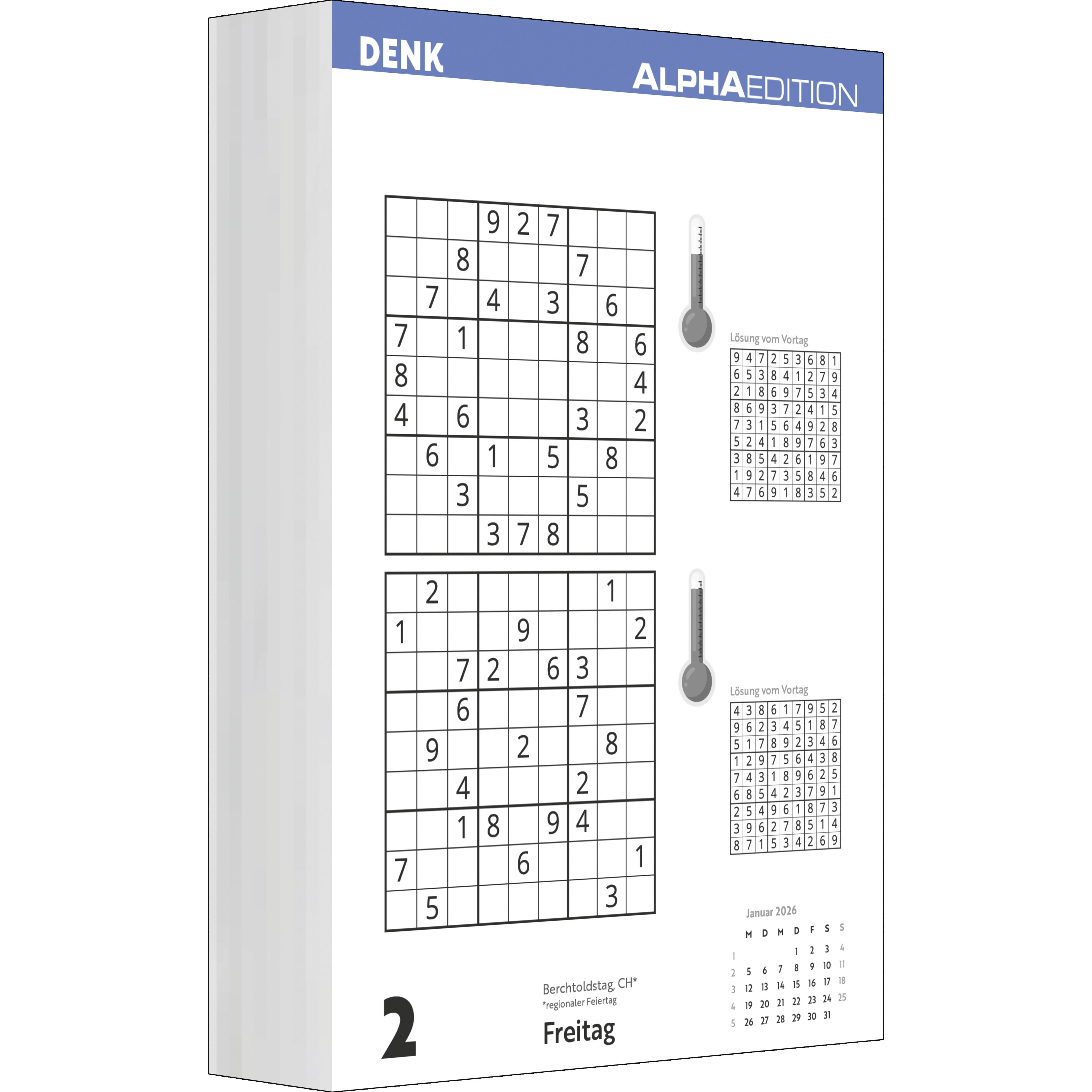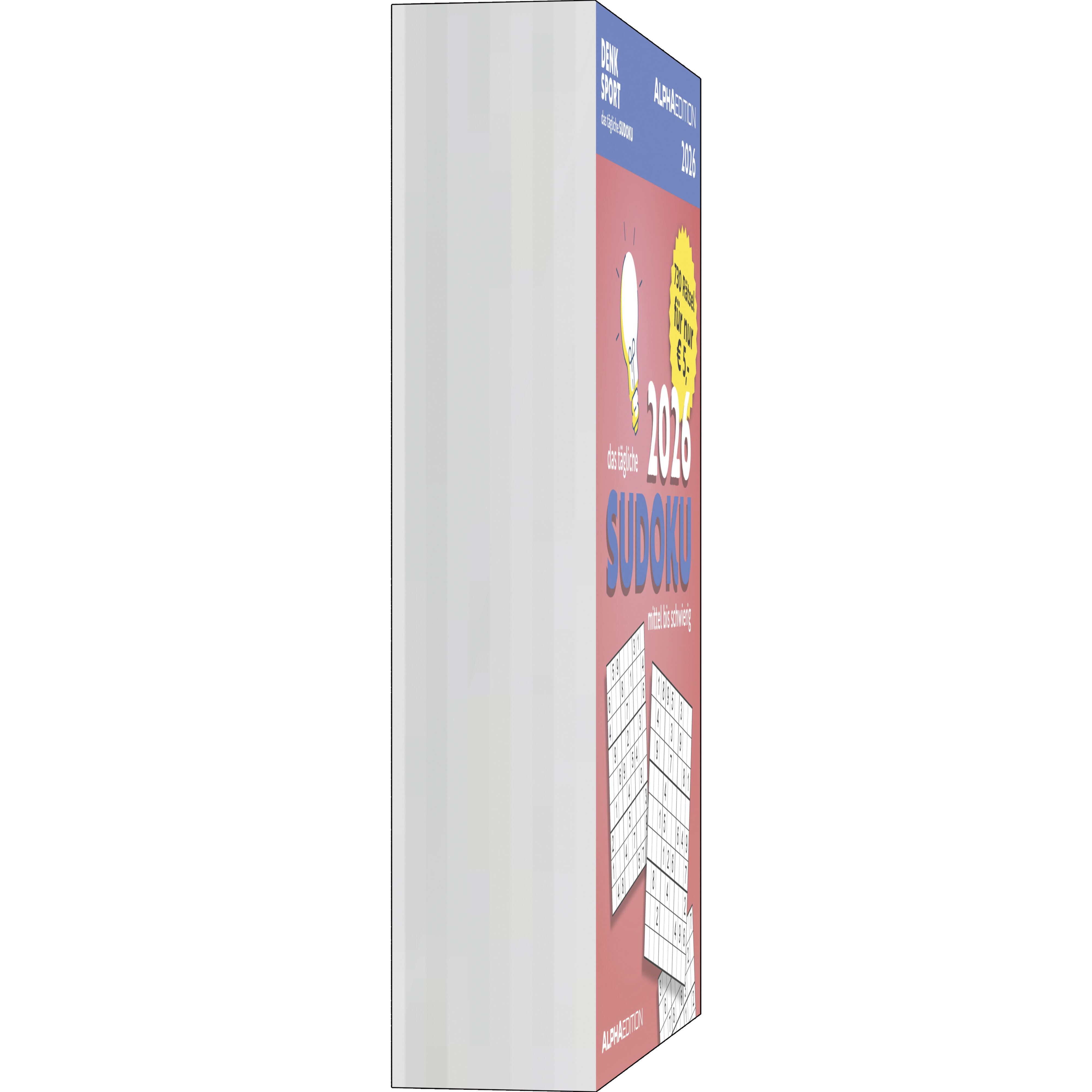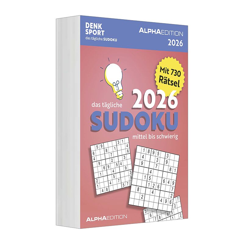 Der Alpha Edition Das tägliche Sudoku Kalender 2026 bietet 313 abwechslungsreiche Zahlenrätsel für clevere Einsteiger und geübte Sudoku-Fans. Mit Schwierigkeitsgrad mittel bis schwer fordert er Konzentration und Logik Tag für Tag. Highlights: Japanischer Räts...28 Kunden haben diesen Artikel kürzlich gekauft.