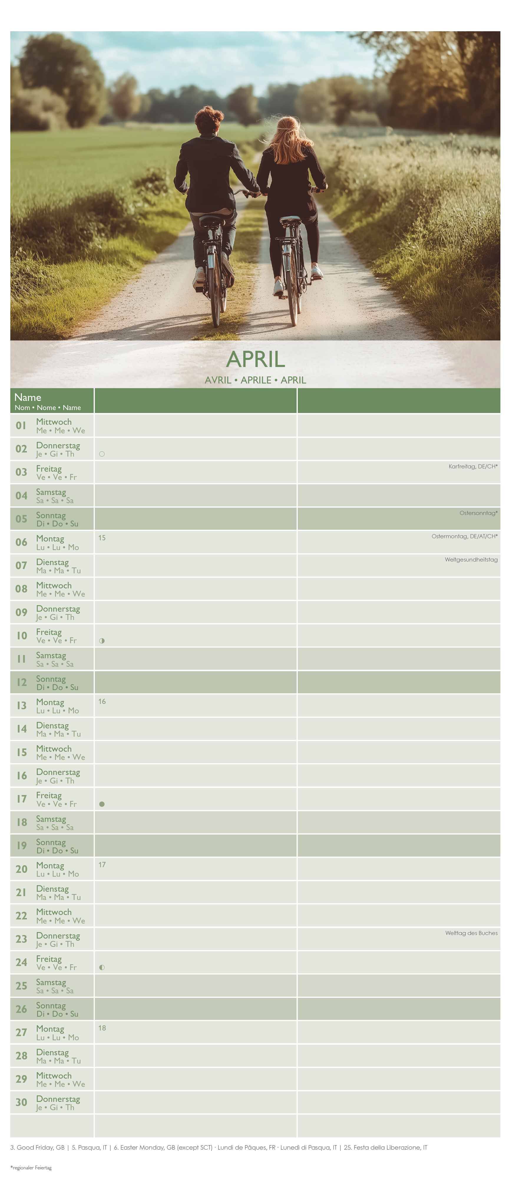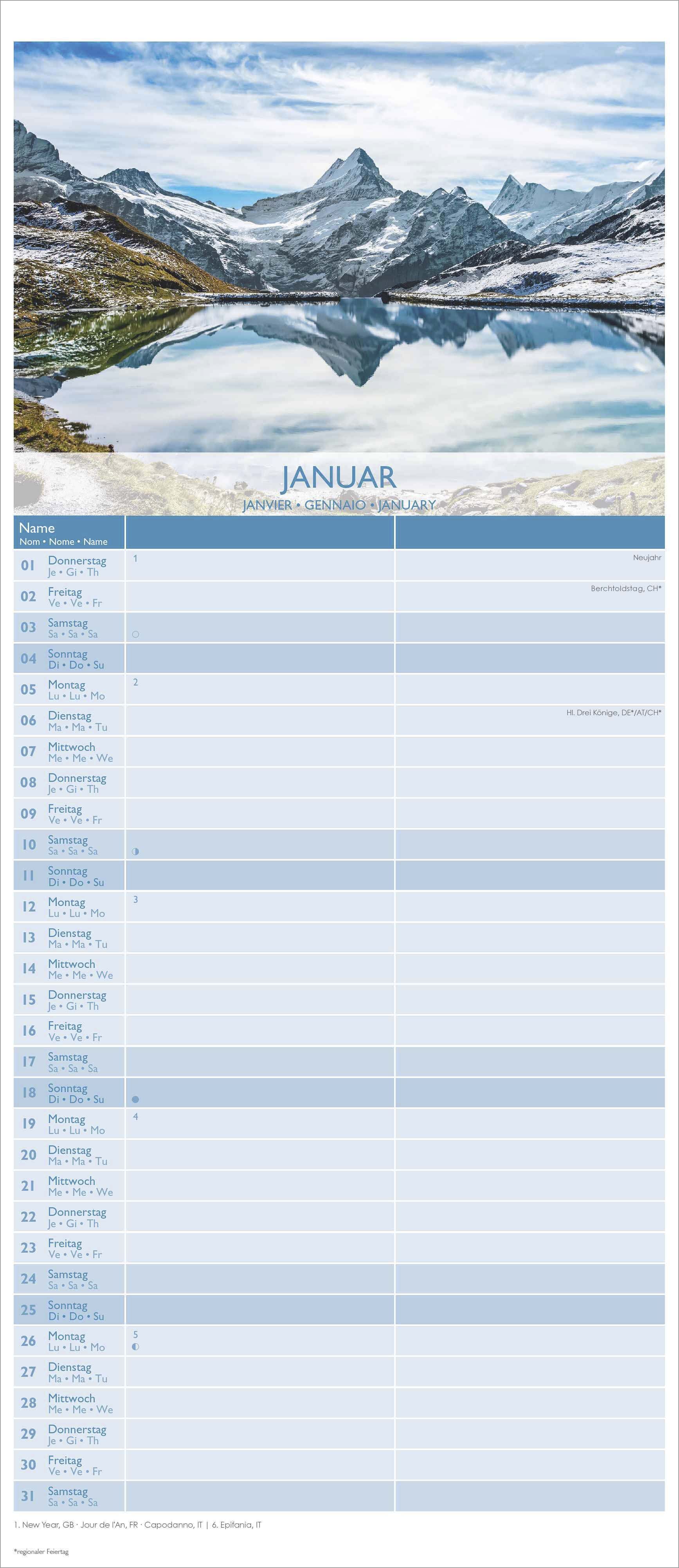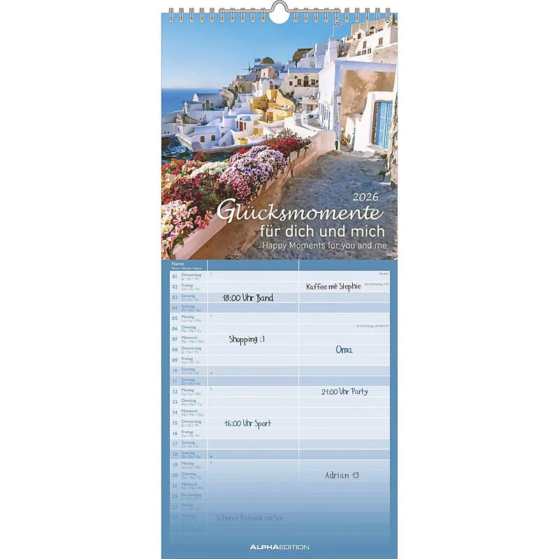 Mehrsprachige Ausgabe Klappentext Der Alpha Edition Familienkalender Glücksmomente für dich und mich 2026 vereint Organisation und Ästhetik. Mit fünf übersichtlichen Spalten, stimmungsvollen Landschaftsmotiven und einem mehrsprachigen Kalendarium behält die ga...