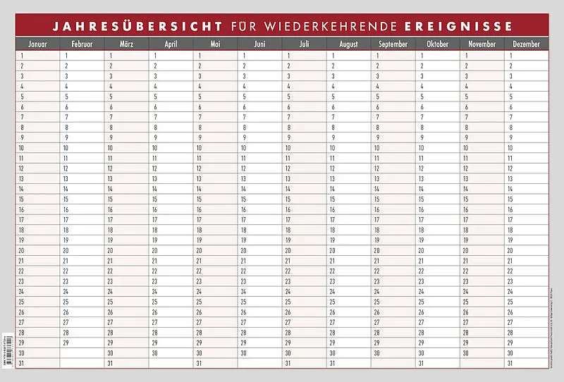 Mit der Jahresübersicht für wiederkehrende Ereignisse im neutralen und übersichtlichem Design haben Sie alle Termine, die sich jährlich wiederholen, auf einen Blick im Blick. So werden Sie keinen Geburtstag, kein Jubiläum, keinen Hochzeitstag mehr vergessen! D...